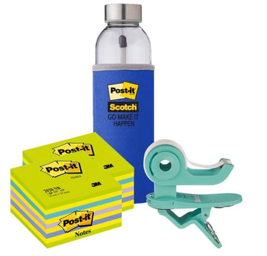 3M Klasični set 1 sadrži Clip&Twist tirkizni ulagač ljepljive trake i dvije Neon kocke Post-it listića. Uz komplet, dobivate i poklon: bocu za vodu Scotch.