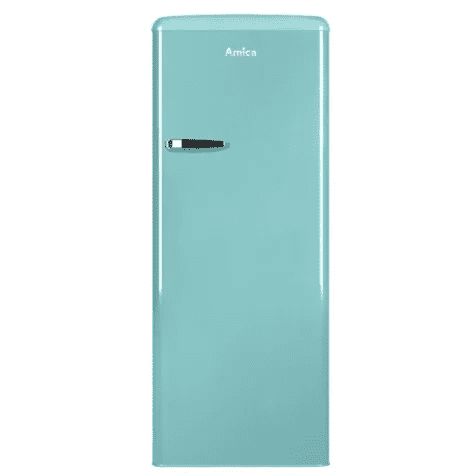 Retro hladnjak Amica KSR 364 150 T, tirkizno plava boja, energetska klasa E, potrošnja energije 157 kWh godišnje, ukupni volumen 218 l, volumen hladnjaka 194 l, volumen zamrzivača 24 l, razina buke 41 dB. Dimenzije VxDxŠ: 144 cm x 55 cm x 61,5 cm.