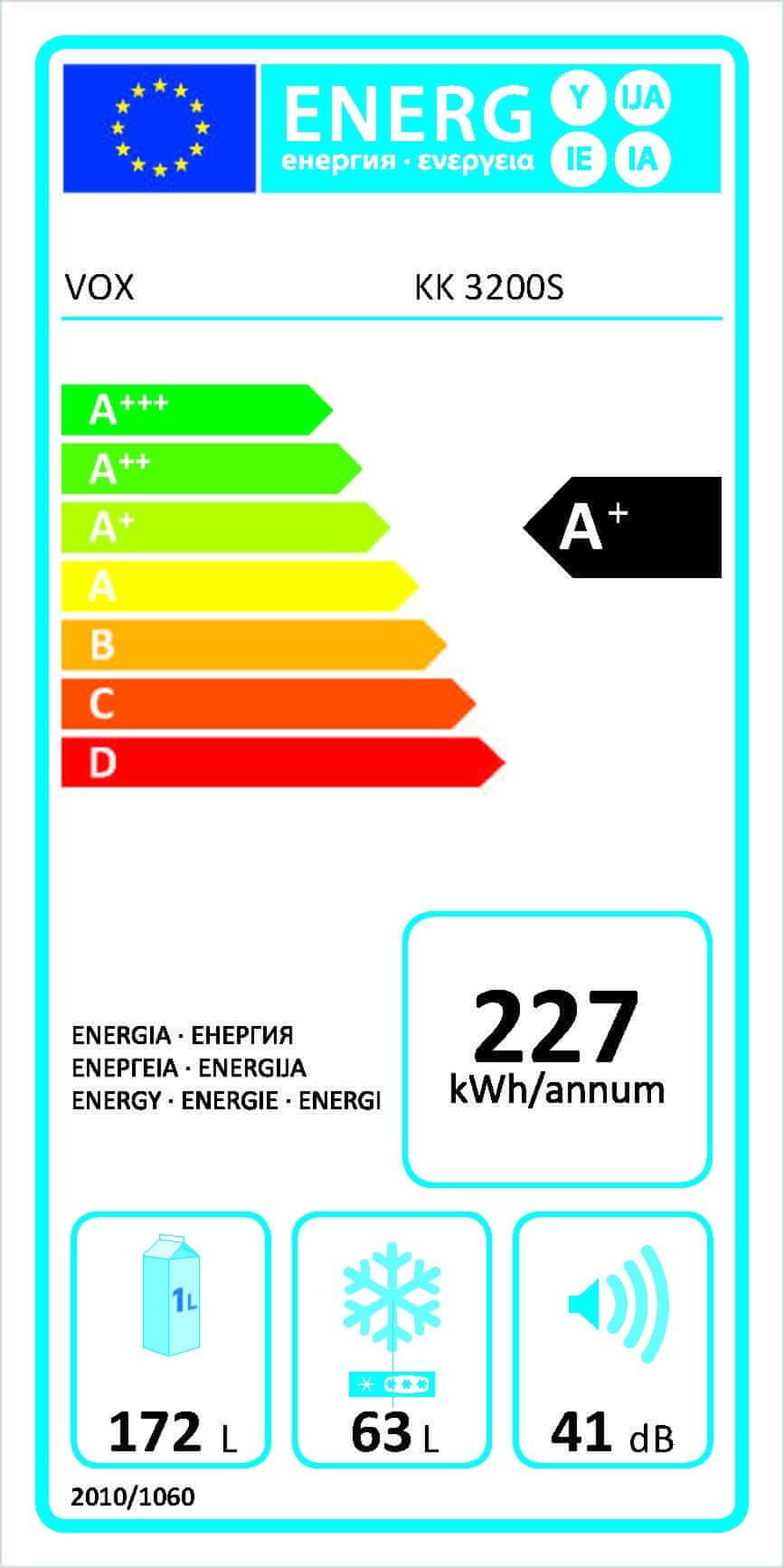 Samostojeći kombinirani hladnjak VOX Electronics KK 3200S pripada energetskom razredu A+. Kapacitet hladnjaka iznosi 172 l, a ledenice 63 l . Ima osvijetljenu unutrašnjost i antibakterijsku zaštitu.