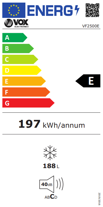 Zamrzivač VOX Electronics VF2500E može se pohvaliti obujmom od 188 l i kapacitetom zamrzavanja od 9,1 kg/24 sata. Pripada je u energetski razred E i troši 197 kWh energije godišnje. Mogućnost promjene smjera otvaranja vrata u kombinaciji s funkcijom Zero Clearance omogućuje postavljanje zamrzivača bilo gdje.