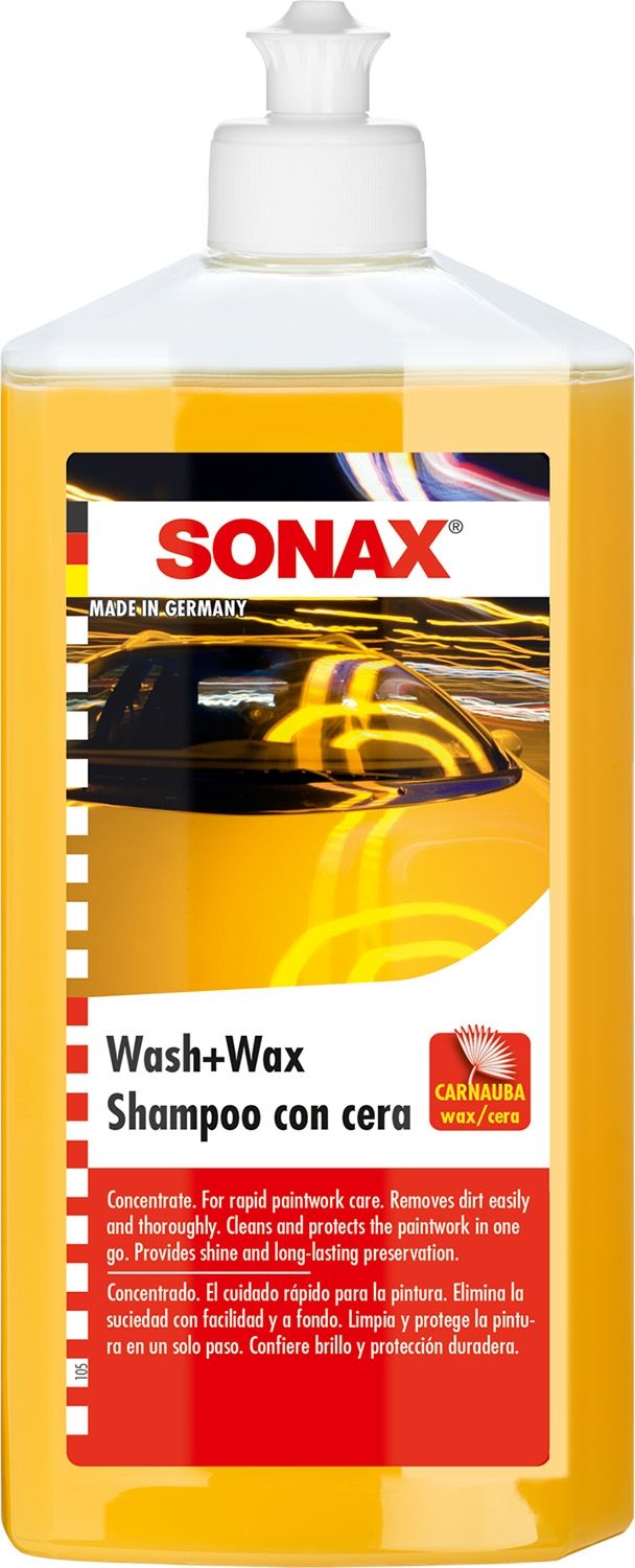 Auto šampon sa Sonax voskom je koncentrirano sredstvo za ručno pranje vozila, s dobrim učinkom pranja jer brzo otapa čestice prljavštine, a istovremeno štiti i stvara tanki film voska na svim lakiranim dijelovima vozilo. Temeljito uklanja prljavštinu u jednom potezu i prekriva lak dugotrajnim zaštitnim filmom od prirodnog karnauba voska. Lak dobiva visoki sjaj i dugotrajnu zaštitu.Bočica sadrži 500 ml sredstva za čišćenje.