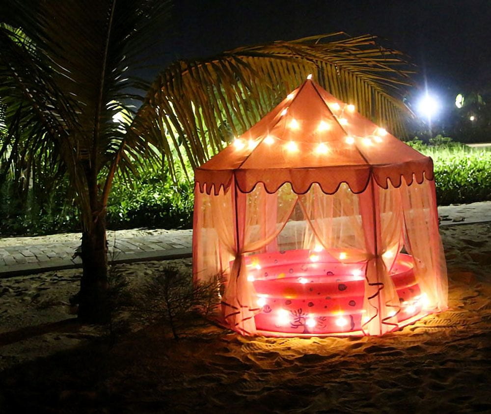 Dječji šator izvrstan je način za kreativnu i maštovitu igru kod kuće i vani. Potiče maštu i omogućuje veselo provođenje vremena sami ili u većem društvu, bez dobnih ograničenja.Šator od tkanine svakako je nezamjenjiv suputnik tijekom dječjih nestašluka. Ima šesterokutnu bazu, 6 ulaznih rupa i vizir u obliku piramide. Igračka ima atraktivan izgled. Ružičasta boja premaza i male svijetle točkice nesumnjivo doprinose estetskoj vrijednosti. Ulazi su prekriveni prozirnim bijelim zastorima koji se savršeno stapaju s ostatkom šatora. Zavjese se mogu vezati na različite načine ili zalijepiti ukrasnim vrpcama. Rješenje koje se koristi s lukovima dodaje šarm i diverzificira zabavu.