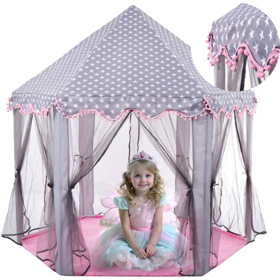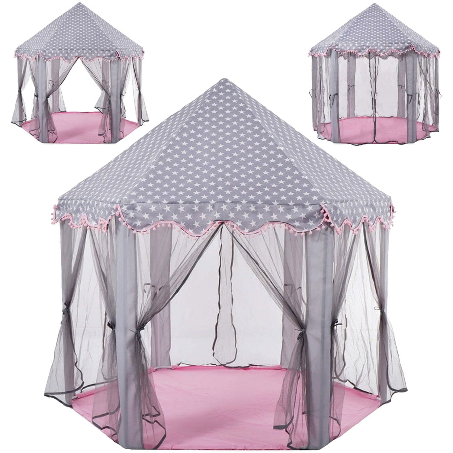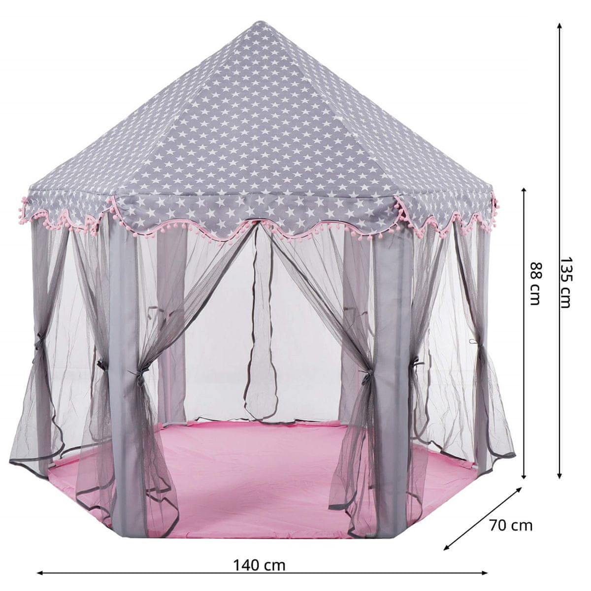 Tražite savršeno mjesto za igru vašeg djeteta? Evo ružičasto-sivog šatora s motivom zvijezde koji će oduševiti svakog mališana! Dodatni pomponi na volanima dodaju jedinstveni šarm.
