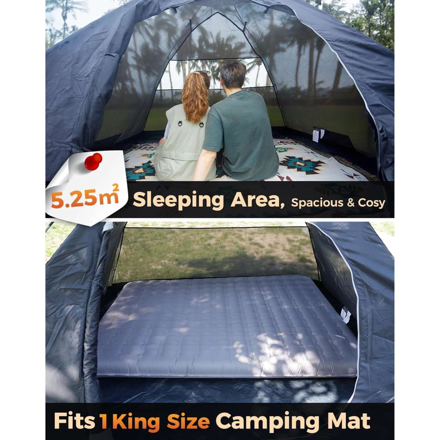 KingCamp HOLIDAY IV kamping šator za 3 do 4 osobe praktičan je kupolasti šator osmišljen za udobnije vikend kampiranje, festivale i manja obiteljska putovanja. Unutarnji prostor za spavanje mjeri 250 × 210 × 130 cm, što pruža dovoljno širine za dva dvostruka madraca i ugodnije noćenje za obitelj ili manju grupu prijatelja. Ukupne dimenzije postavljenog šatora iznose 310 × 260 × 135 cm.