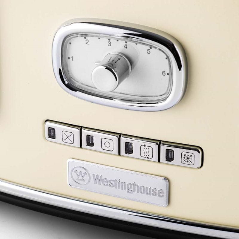 Nema više čekanja u redu da napravite svoj sendvič! Westinghouse Retro White 4 Slice toster može tostirati čak 4 kriške kruha istovremeno. Elegantni toster opremljen je s 4 utora za 4 izdašne kriške kruha, rešetkom za zagrijavanje i funkcijom automatskog centriranja. Zahvaljujući podesivim položajima tostiranja, uvijek vam je zajamčen ukusan, ravnomjerno prepečen kruh. Osim toga, uređaj također ima funkciju odmrzavanja, zagrijavanja i funkciju otkazivanja. Kombinirajte toster s drugim kuhinjskim aparatima iz Westinghouse Retro serije i stvorite zapanjujuću kuhinju!