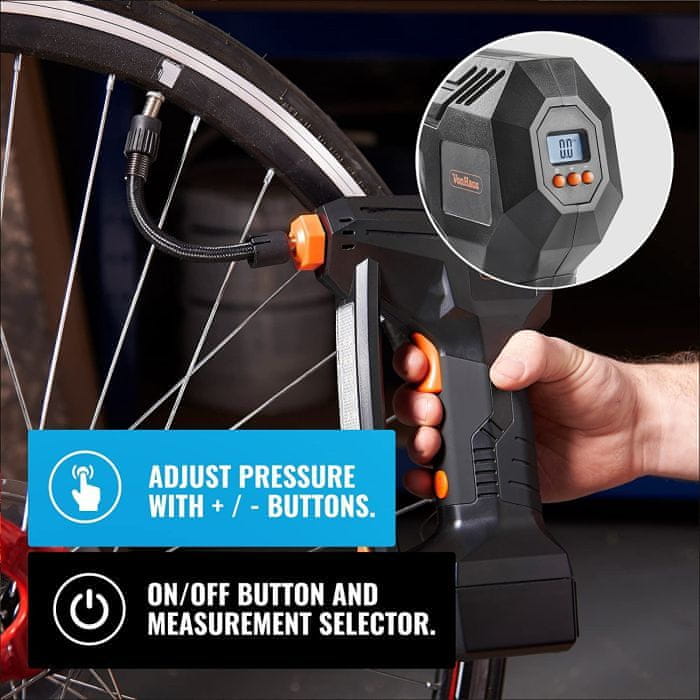 VonHaus 12V bežični punjač za gume je prijenosan. Jednostavno puni gume, igračke i sportsku opremu. Ima litij-ionsku bateriju od 1500mAh i adapter za punjenje iz 12V utičnice u autu. Opremeljen je LCD zaslonom s digitalnim mjeračem tlaka.