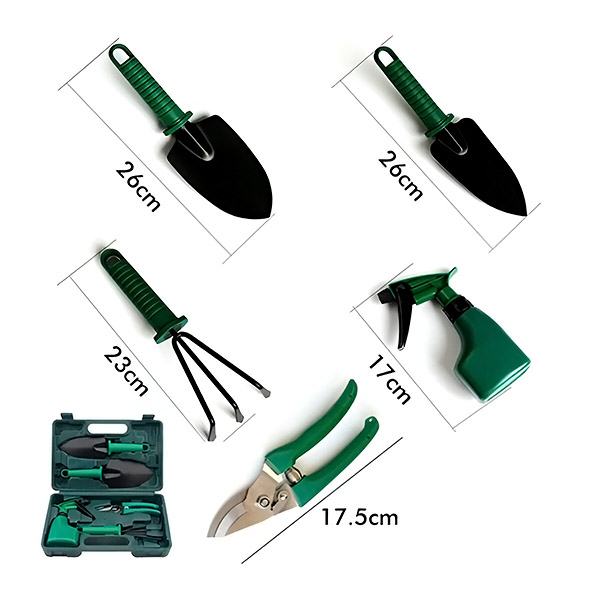 1 x Set vrtnog alata s kutijom za pohranu: 1 kandža/grablje za plijevljenje, 2 žlice za sadnju, 1 škare za rezidbu, 1 raspršivač.