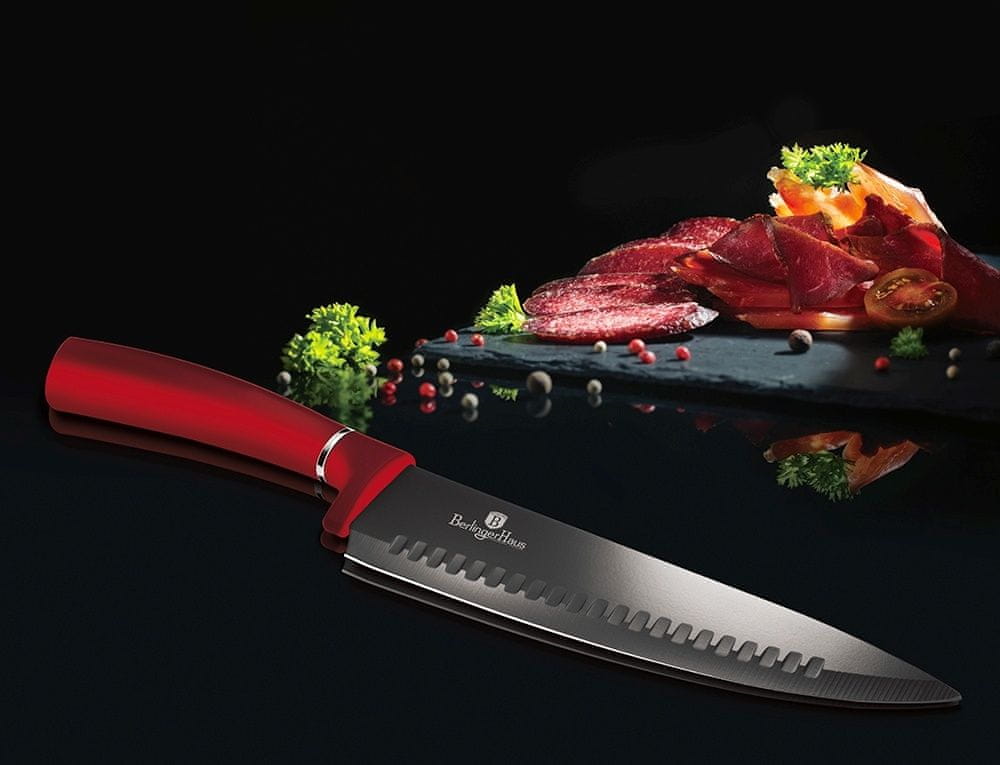 Komplet noževa od nehrđajućeg čelika s površinom protiv prianjanja. BerlingerHaus Burgundy Metallic Line komplet noževa z magnetnim držačem, 6 komada imaju ergonmski neklizajuće ručke SoftTouch. Noževi se mogu prati u perilici posuđa Komplet noževa sadrži kuharski nož – 20 cm, nož za pecivo – 20 cm, Santoku nož – 17,5 cm, univerzalan nož – 12,5 cm, kuhinjski nož – 9 cm i magnetnim stalkom.