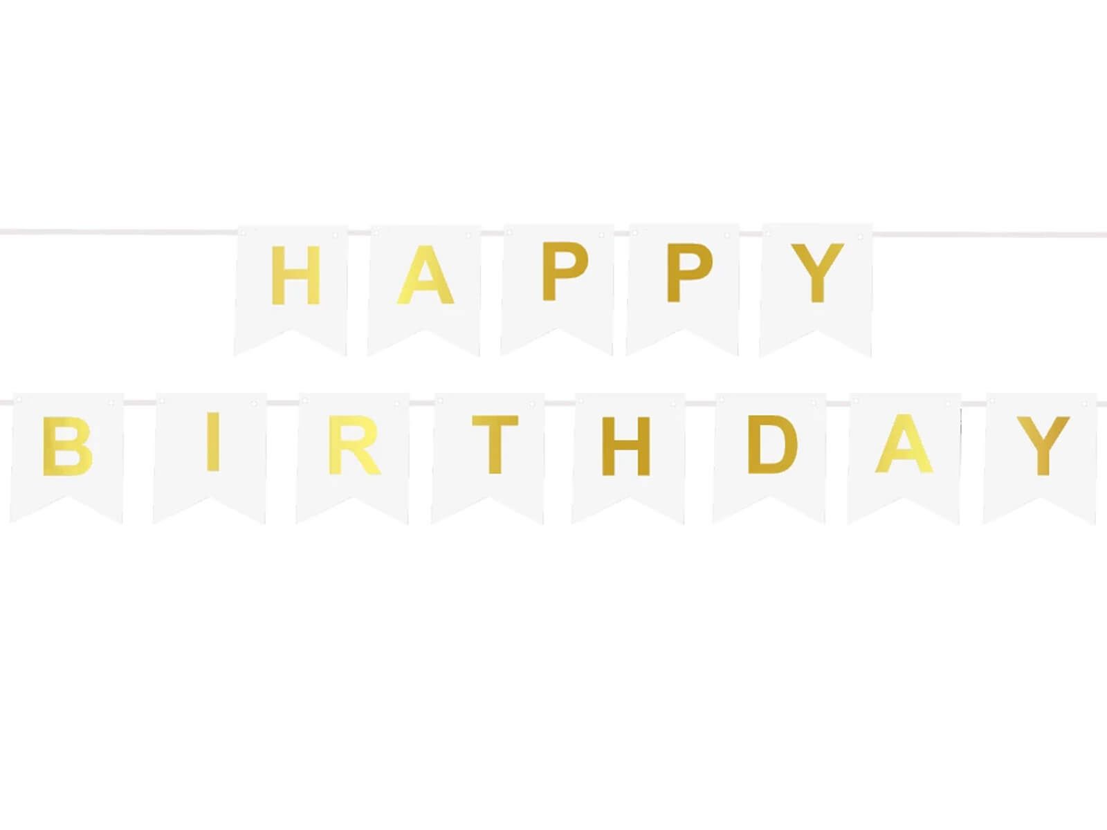 Bijeli transparent sa zlatnim natpisom Happy Birthday, idealan za dječji rođendan.