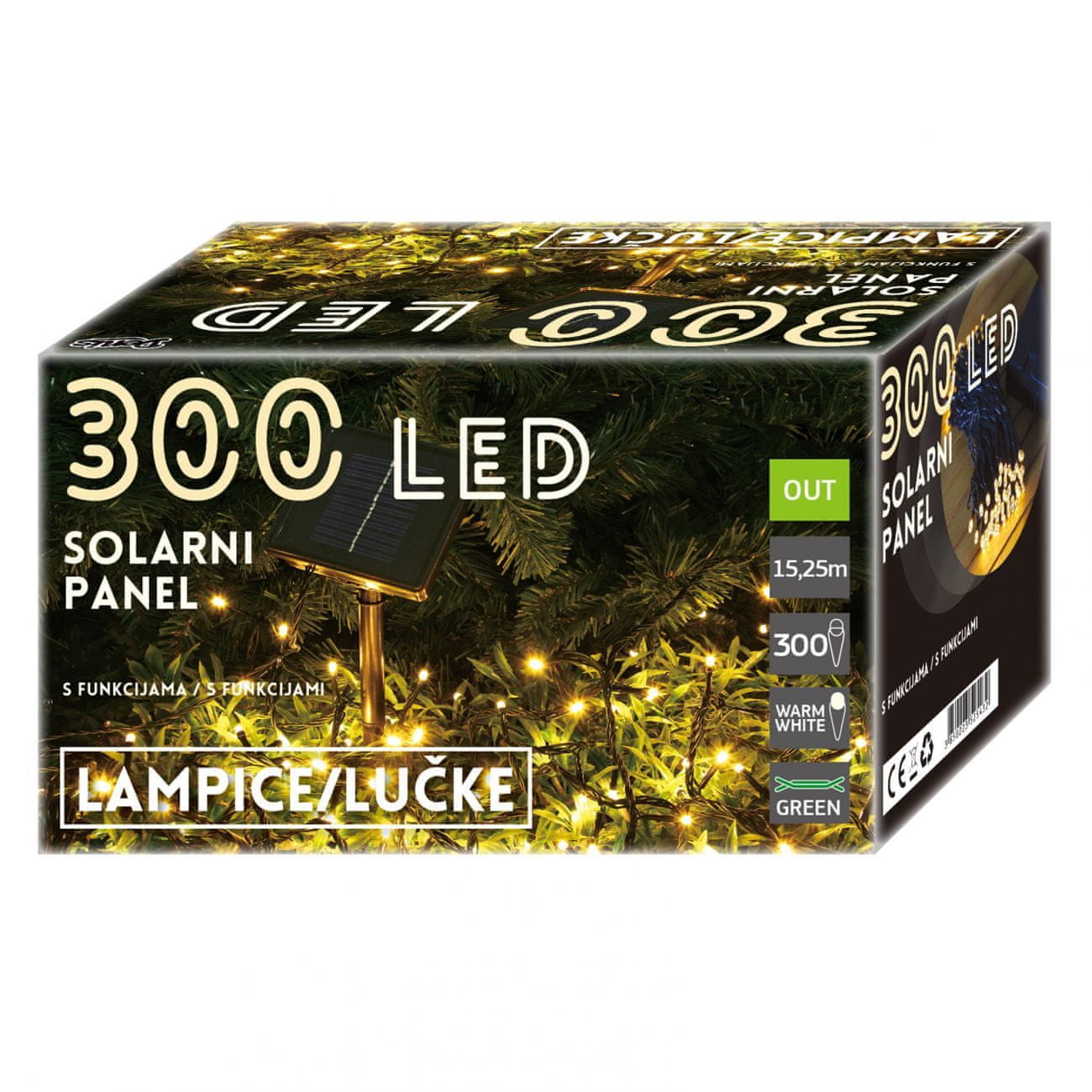 Solarni panel 300 LED lampica na zelenoj žici. Svjetlo toplo bijelo. Duljina niza lampica 14.95 m. Duljina električnog kabela od odjeljka za baterije do prve lampice 0.3 m. 8 funkcija. Radi na baterije: 1× AA Ni-Mh1.2V1200mAh. Trajanje svijetla oko 6 sati. Punjenje oko 8 sati. Za vani. Cijeli opis