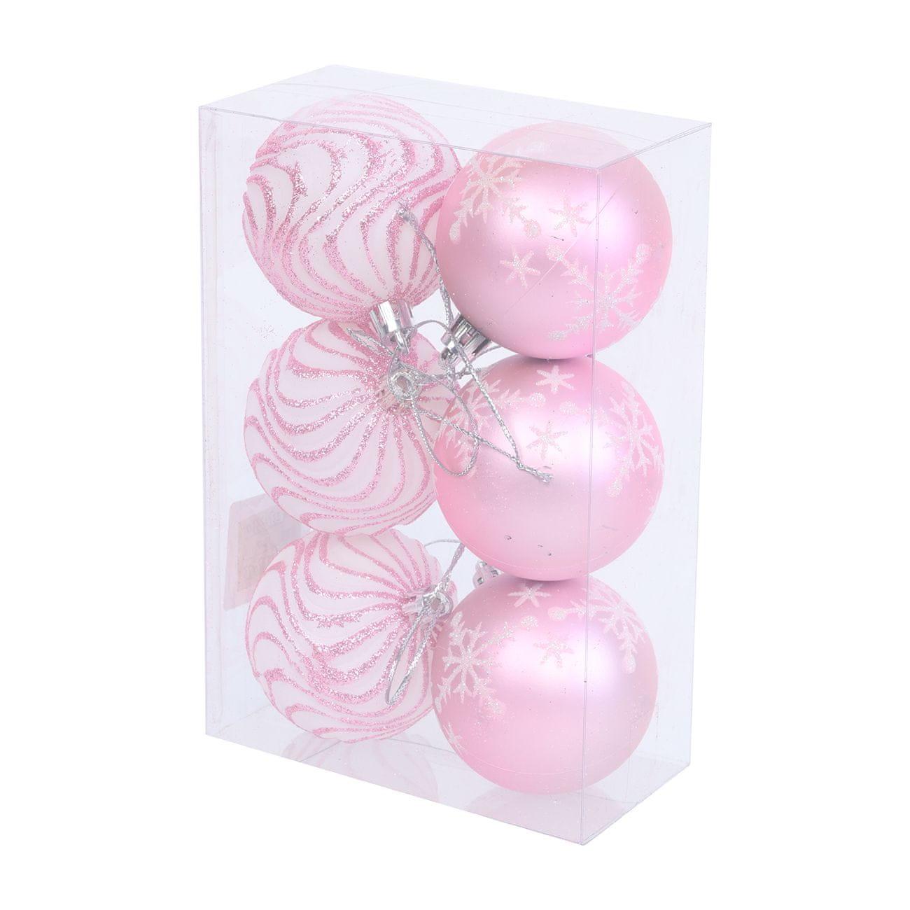 Vrsta: božićna dekoracija. U setu: 6× kuglica. Veličine: 8 cm. Boje: roza. Uzorak: profilirane, s dekoracijom. Materijal: plastika.