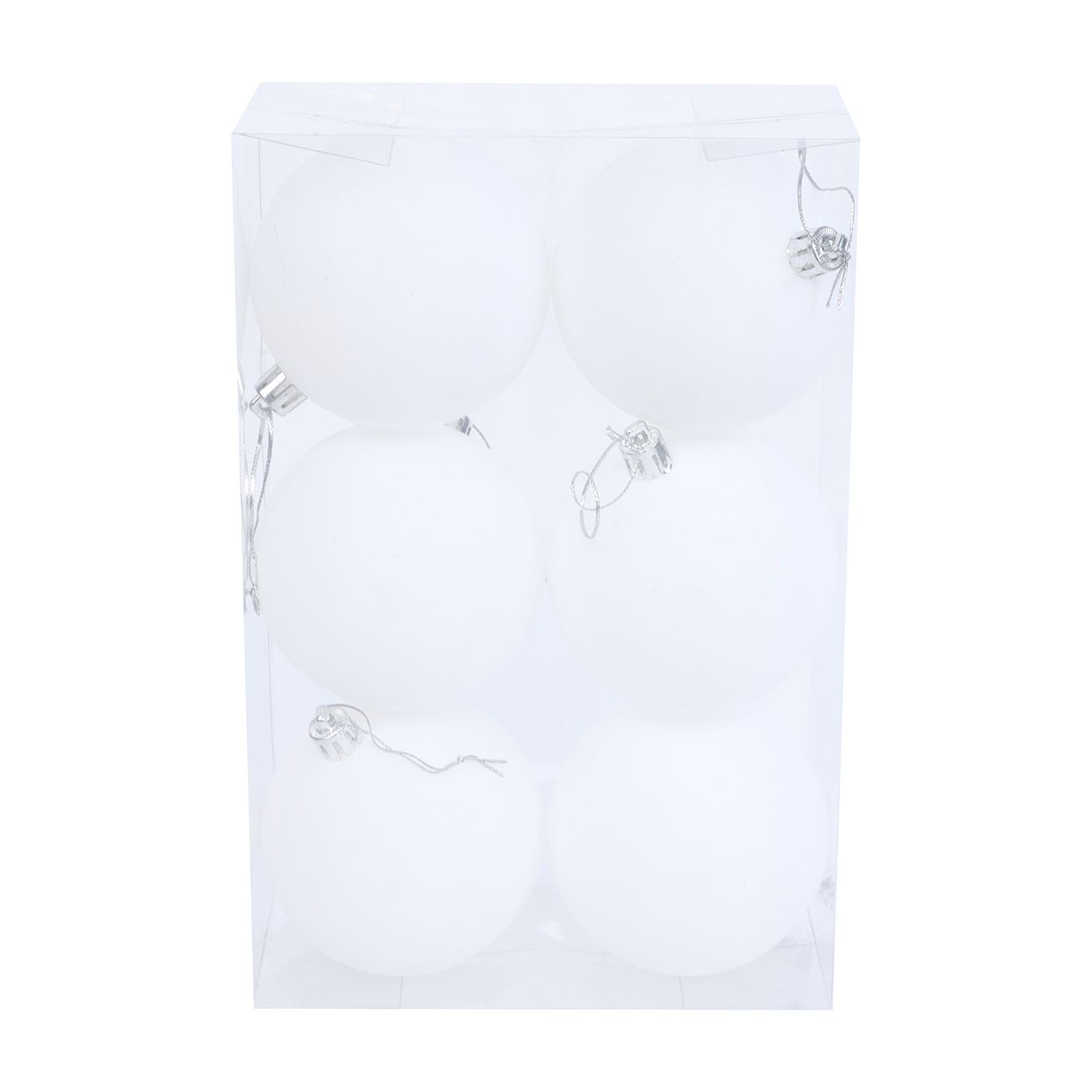 Vrsta: božićna dekoracija. U setu: 6× kuglica. Veličine: 8 cm. Boje: bijele. Materijal: plastika. Cijeli opis