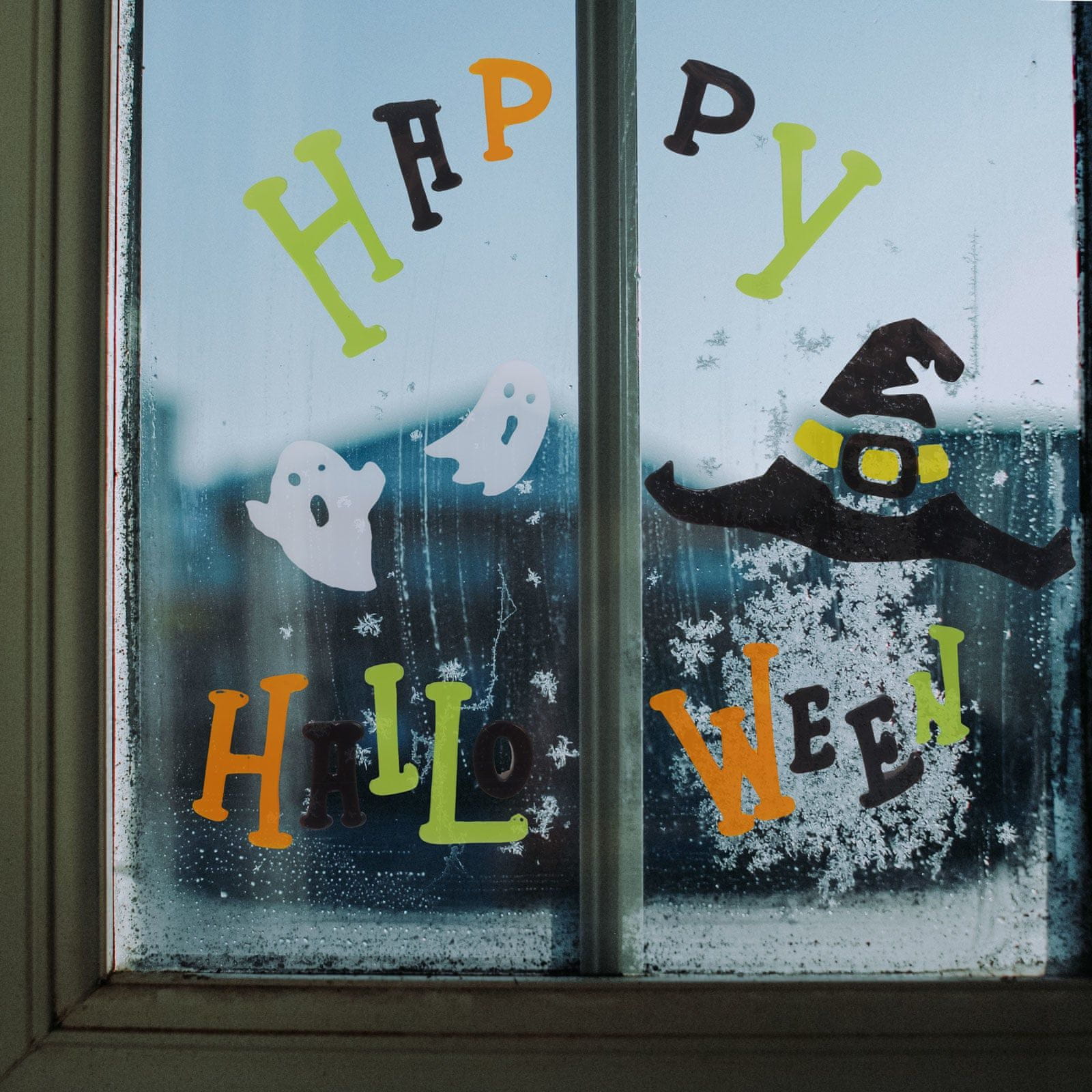 Naljepnice za prozore Sretan Noć vještica. Naljepnice se mogu zasebno lijepiti tako da ih možete rasporediti po prozoru. Lako se lijepe i uklanjaju bez ikakvih ostataka. Ne sadrže ljepilo, sam gel se lijepi i može se isprati mlakom vodom kako bi se ponovno zalijepio na staklenu površinu.