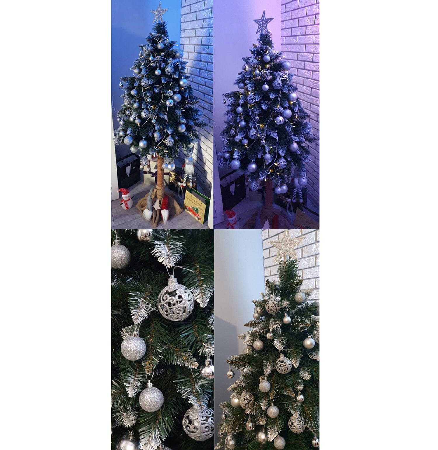 - SPECIFIKACIJA – boja: srebrna; materijal: plastika; broj komada u setu: 100 + zvjezdica; vrste kuglica: mat, sjajne, sjajne, otvorene; promjeri kuglice: 6/4/3 cm; dimenzije zvijezde (dužina / širina): 12/14 cm; težina: 0,7 kg; težina paketa: 0,9 kg.