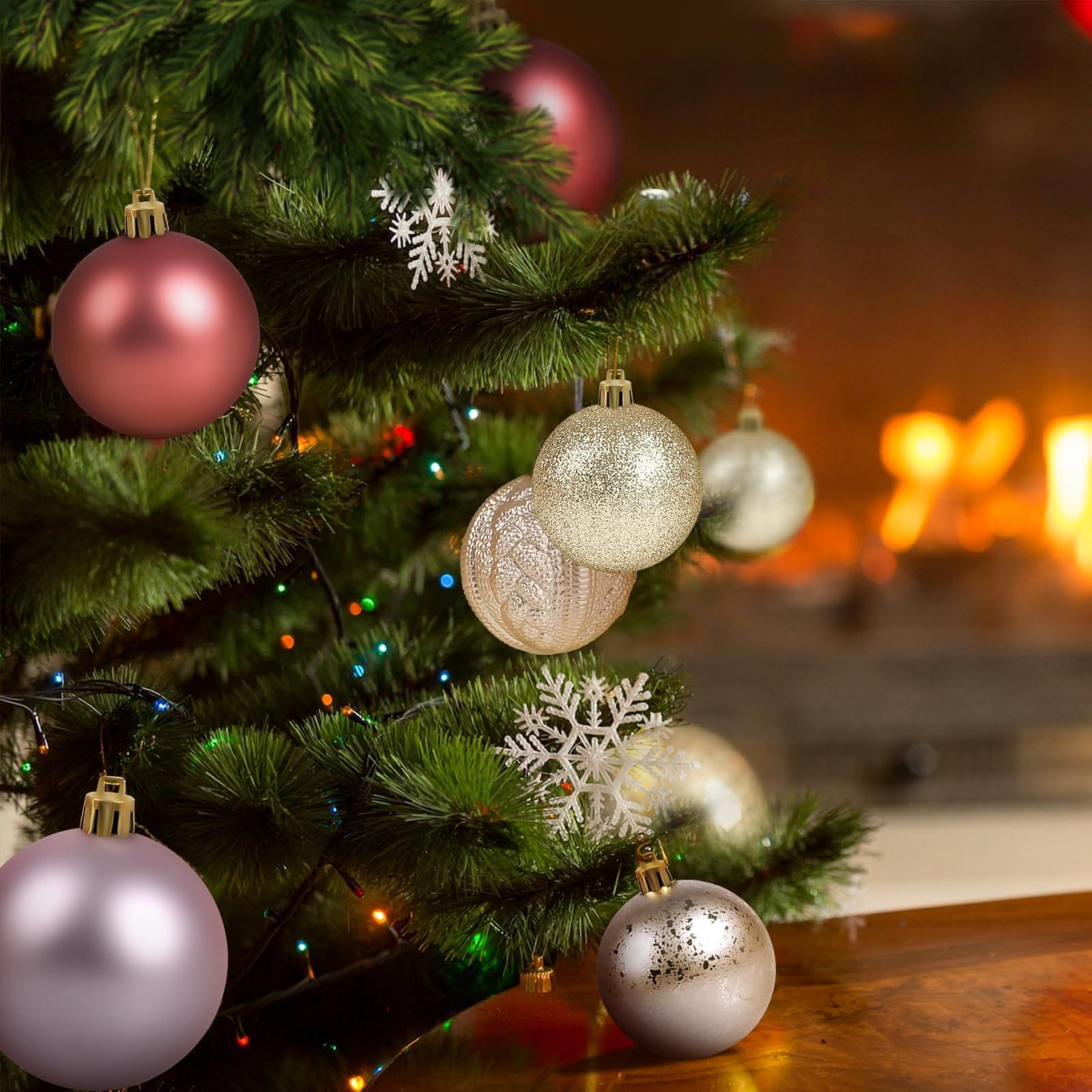 Set 20 nelomljivih božićnih kuglica (6 cm) u crvenoj, zlatnoj i ružičastoj boji. Sigurne za dom s djecom i ljubimcima, spremne za vješanje. Savršene za elegantno ukrašavanje jelke i interijera.