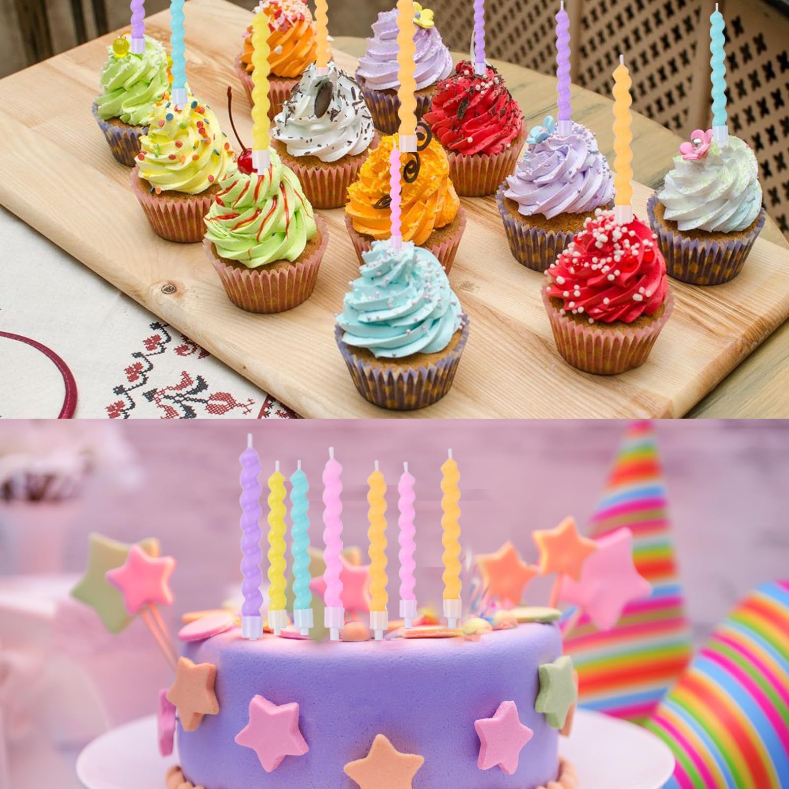 Set od 24 spiralne rođendanske svijeće marke Bolosa predstavlja dekorativni dodatak za svaku proslavu. Šarene svijeće u nijansama ružičaste, žute, narančaste, plave, svijetloplave i ljubičaste boje doprinose radosnom raspoloženju i daju rođendanskoj torti poseban karakter. Zahvaljujući spiralnom obliku, svijeće izgledaju efektno na tortama, kolačima ili desertima. Svaka svijeća ima duljinu od približno 9,6 cm (3,8″), s držačem duljine 3,3 cm (1,3″), što osigurava stabilno postavljanje na tortu. Gore oko 4 minute, a plastični stalak omogućuje podešavanje visine svijeće.