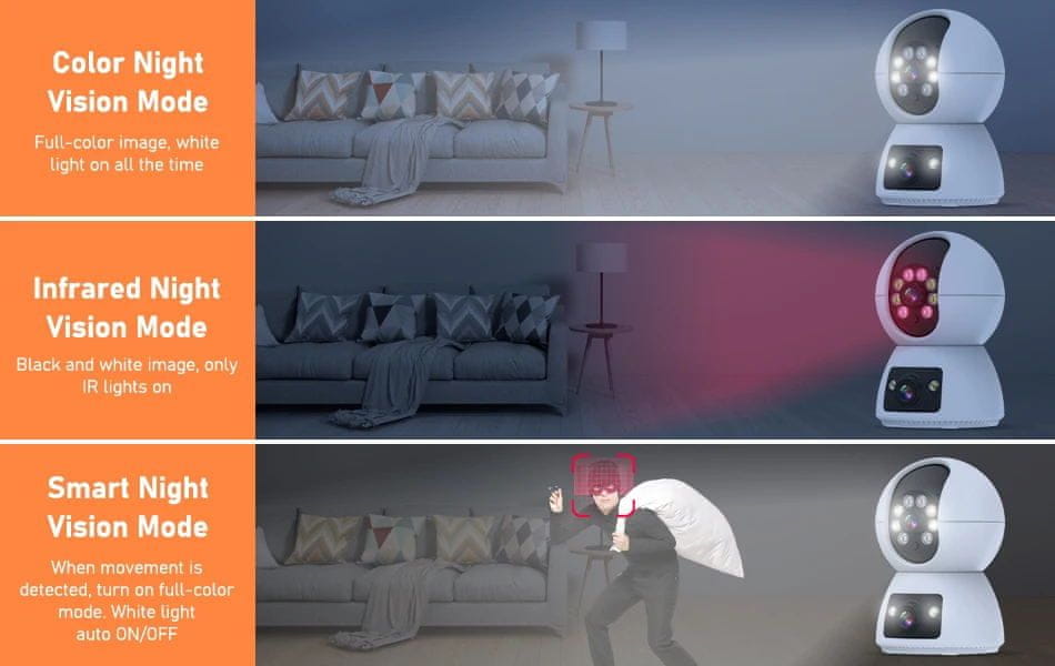 BOT unutarnja WiFi kamera NA3 s dvostrukim objektivom pruža video izlaz u rezoluciji 1920*1080, što znači da vam neće promaknuti niti jedan važan detalj. Zahvaljujući automatskom praćenju pokreta i inteligentnoj detekciji zvuka alarma, odmah ćete biti obaviješteni o svakoj neuobičajenoj aktivnosti u vašem domu, čak i noću zahvaljujući noćnom vidu.