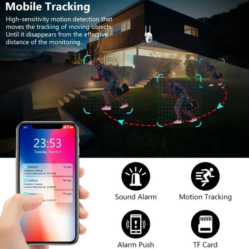 Ugrađeni responzivni mikrofon na vanjskoj sigurnosnoj kameri, zahvaljujući kojemu možete slušati i razgovarati putem naše aplikacije. Dvosmjerni zvuk omogućuje komunikaciju s prijateljima, a alarmom za otkrivanje pokreta možete se riješiti neželjenih gostiju ili životinja.