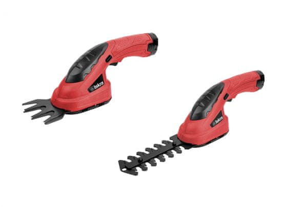 Akumulatorske škare za travu i grmlje Iskra N0E-11ET-3.6-B s naponom 3,6 V, 1,5 Ah Li-ion baterijom, širinom reza 80 mm (trava), te dužinom 110 mm (grmlje). Opseg isporuke uključuje bateriju i punjač.