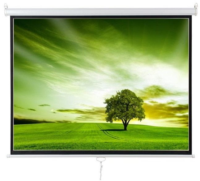 Manualno projektorsko platno PSM-112–2, 112'' (200×200 cm), mat bijela tkanina, kompatibilno s formatima 16:9, 4:3 in 1:1, kut gledanja 160°, montaža na zid ili strop, osmerokutno kućište od čelika.