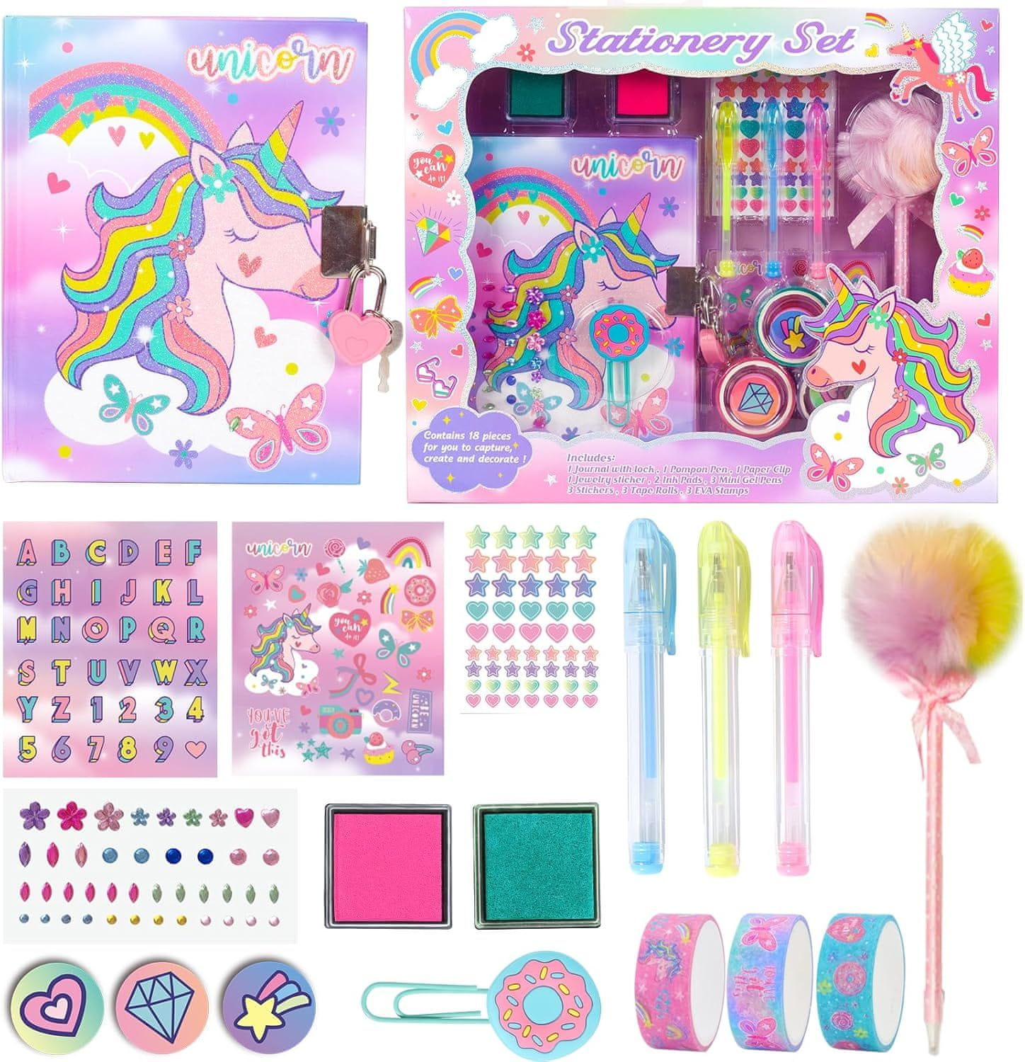 Ovaj kreativni pisaći set s motivom jednoroga pruža djevojčicama mogućnost za izražavanje vlastite mašte i očuvanje osobnih uspomena. Središnji dio seta čini funkcionalni dnevnik opremljen sustavom za zaključavanje, što korisniku omogućuje privatnost pri zapisivanju misli ili izradi crteža. Set je osmišljen kako bi potaknuo razvoj umjetničkih vještina kroz upotrebu različitih dekorativnih elemenata. Uz vizualno privlačan dizajn i šarene motive, ovaj komplet predstavlja praktično rješenje za igru kod kuće, u školi ili tijekom putovanja, budući da dolazi u organiziranom pakiranju koje olakšava prijenos svih dijelova.
