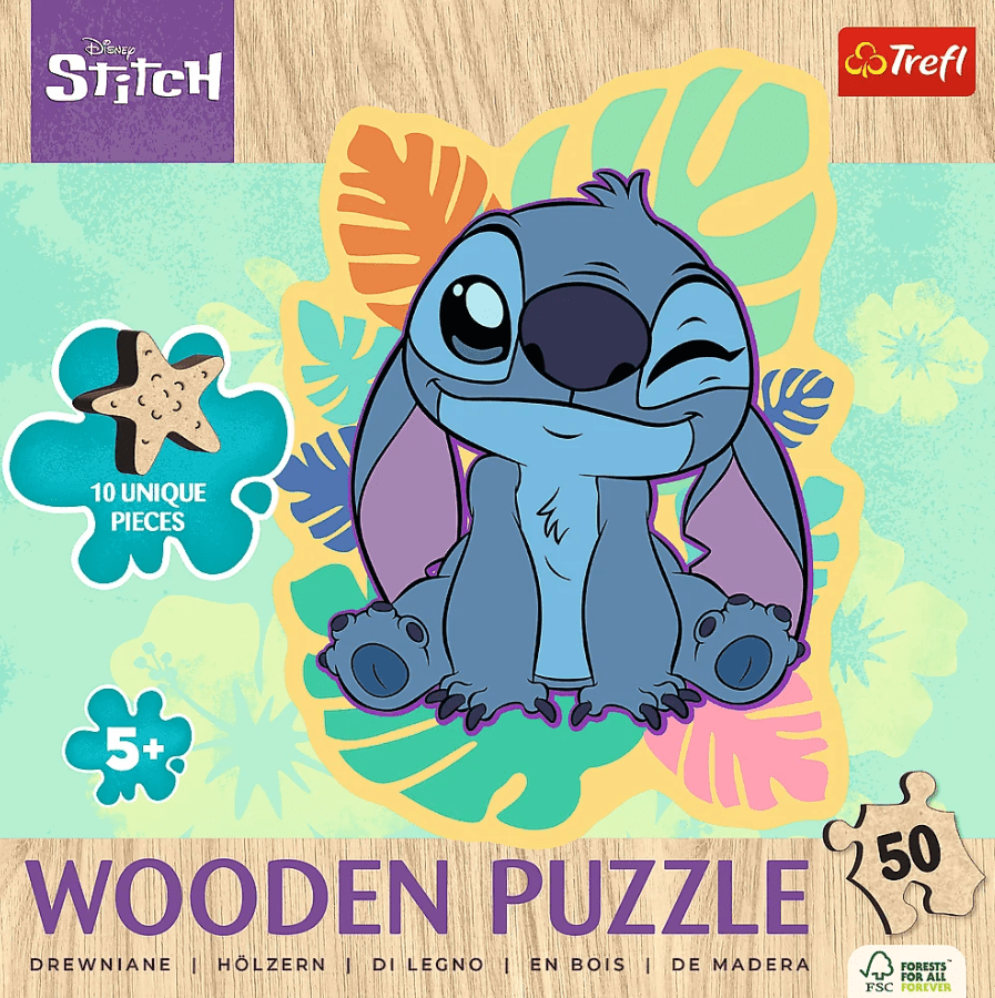 Treflova drvena slagalica od 50 dijelova s motivom Lilo i Stitch privući će vaše dijete zanimljivom ilustracijom i potaknuti ga na slaganje. Slagalica pomaže u razvoju fine motorike i prikladna je za djecu stariju od 5 godina.