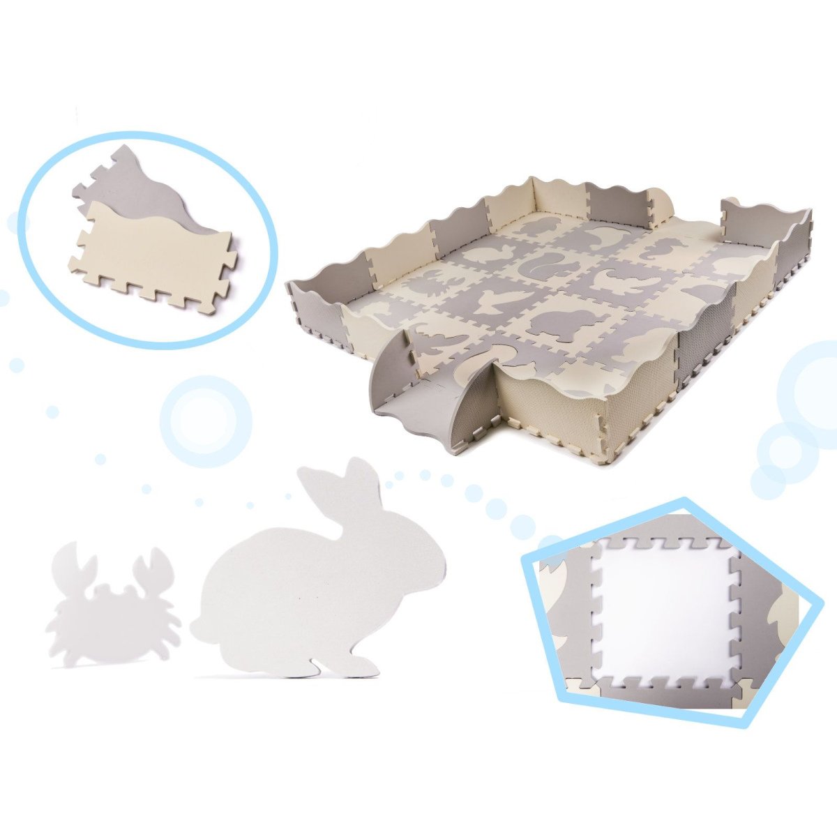 Pjenaste slagalice – podloga za igru i ogradica u jednom, odvojivi oblici i životinje, mekana EVA pjena, protuklizna i vodootporna površina, mogućnost stvaranja 3D oblika