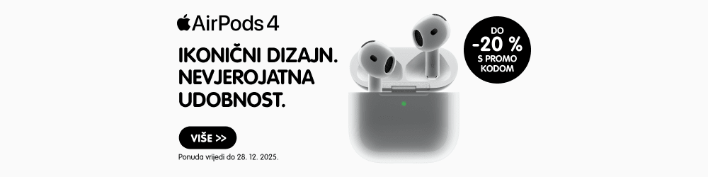 Bežične slušalice Apple AirPods 4 imaju Bluetooth 5.3 tehnologiju, podesivi equalizer i Spatial Audio efekt. Opremljene su dinamičkim Apple driverima s dodatnom pomičnom membranom, podržavaju glasovno upravljanje i rade 5 sati s jednim punjenjem. Kutija za punjenje s USB-C pruža ukupno do 30 sati rada s jednim punjenjem.