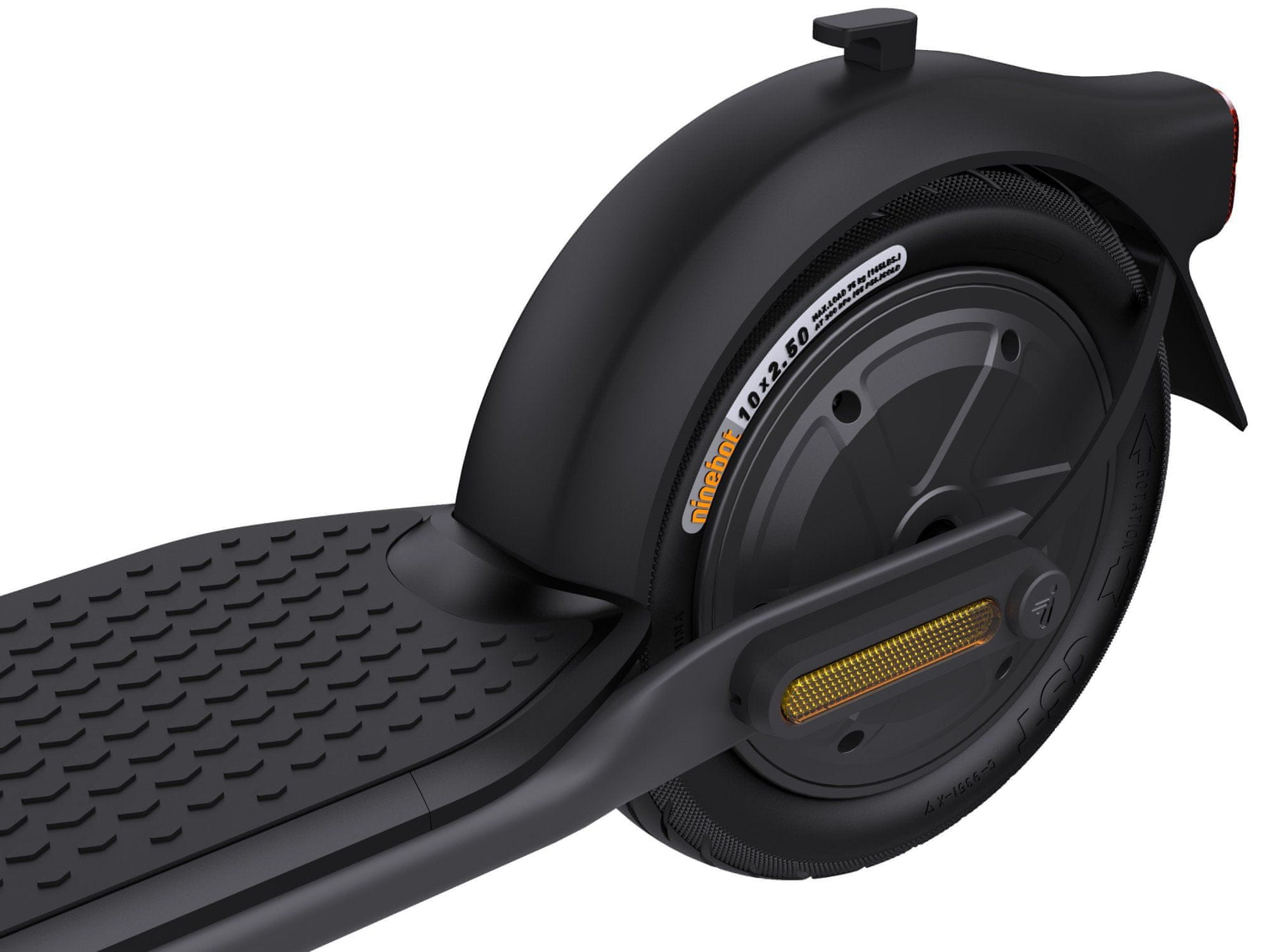 Električni romobil Segway F2 E opremljen je gumama bez zračnica 25,4 cm (10'') pogodnim za vožnju po neravnim cestama ili neravnom terenu, a gel premaz smanjuje rizik od bušenja. Dvostruki sustav prednjih diskova i stražnjih elektroničkih kočnica, prednja i stražnja LED svjetla visokih performansi, prednji i stražnji pokazivači smjera i praktično zvonce osiguravaju vašu sigurnost. Serija F2 dizajnirana je sa širim upravljačem za stabilnu vožnju, koja također omogućuje više prostora za dodatke kao što je držač za telefon i promjenjive načine vožnje. Zbog trokutaste konstrukcije od čvrstog čelika, električni romobil sa IPX5 zaštitom spreman je za sve vremenske izazove.