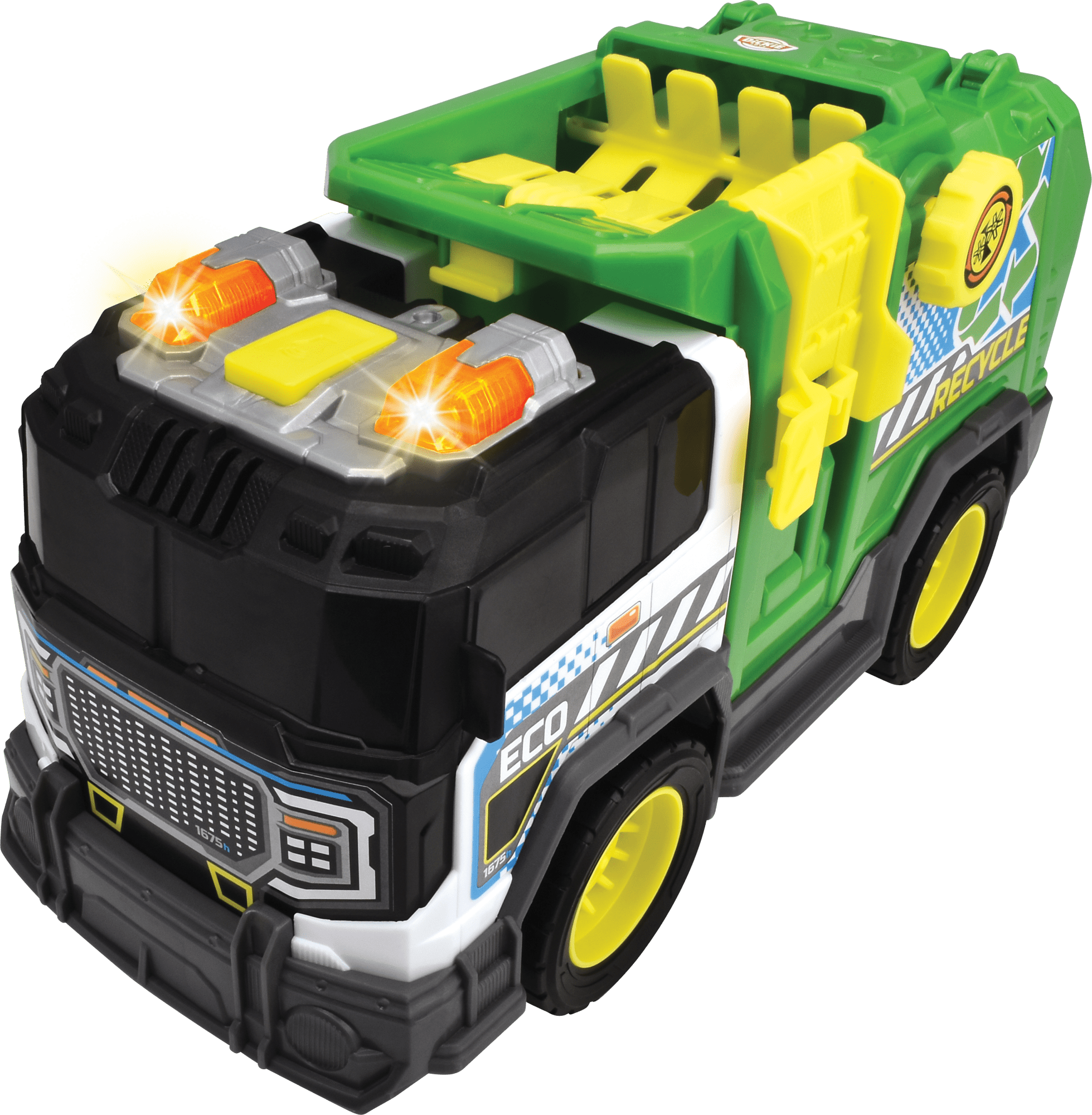 Dickie kamion za smeće ima realistične svjetlosne i zvučne efekte i izbacivač diskova na krovu. Također ima ručni bočni utovarivač, drobilicu smeća i stražnja vrata koja se otvaraju.
