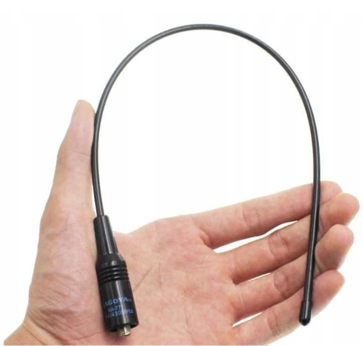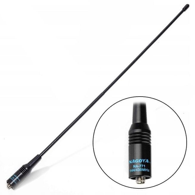 Originalna dvopojasna antena Nagoya NA-771 s visokim dobitkom i SMA-F konektorom, zbog kojeg je kompatibilna s većinom modela radiostanica Baofeng. Antena NA-771 izrađena je od mekog materijala, što omogućuje njeno savijanje bez straha od loma.