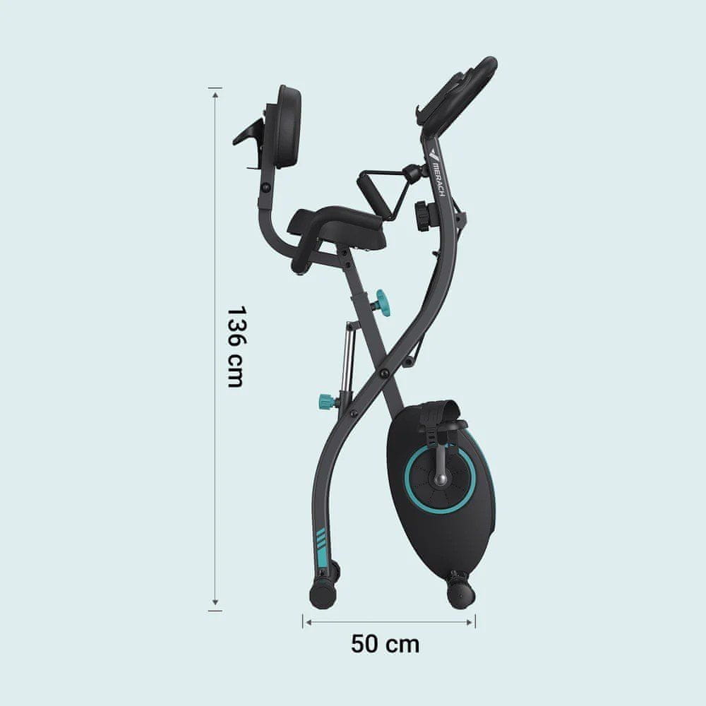 Merach S15B2 4-u-1 sobni bicikl – crni Doživite cjeloviti trening s Merach 4-u-1 sobnim biciklom: uspravno i ležeće pedaliranje te vježbe za ruke i leđa. S 16 razina magnetskog otpora, interaktivnim LCD zaslonom, mjerenjem otkucaja srca i udobnim sjedalom. Sklopivi dizajn štedi prostor i idealan je za kućnu upotrebu. Ključne značajke Sklopiv dizajn LCD zaslon Mjerenje otkucaja srca 16 razina magnetskog otpora Nosivost: 136 kg Interaktivni LCD zaslon Držač za bocu s vodom Podesiva visina sjedala Elastične trake za vježbanje ruku i leđa Prikladan za visinu korisnika od 132 cm do 185 cm Omogućuje uspravno i ležeće pedaliranje te trening ruku i leđa 4 u 1 – Višenamjenski dizajn Ovaj inovativni sklopivi dizajn nudi uspravni i nagnuti način vožnje, kao i vježbe za ruke i leđa. Omogućuje različite fitness režime i ciljani trening za sve glavne mišićne skupine u tijelu. Poboljšano sjedalo i udobnost Maksimalna udobnost U odnosu na klasične bicikle, Merach S15B2 nudi znatno poboljšano, prostranije sjedalo i veću razinu udobnosti tijekom vožnje. 16 razina magnetskog otpora Jednostavno podešavanje intenziteta treninga Unaprijeđeni magnetski sustav otpora omogućuje tiši i glađi rad, a zahvaljujući 16 razina otpora lako možete prilagoditi intenzitet i ritam treninga te učinkovitije ostvariti svoje fitness ciljeve. Izvrsna nosivost i prilagodljivost Sklopivi bicikl izrađen je od visokokvalitetnog čelika i može podnijeti do 136 kg. Visina sjedala je podesiva i prikladna za korisnike visoke 132 – 185 cm. Kvalitetni materijali i dizajn Poboljšani materijali i boje osiguravaju duži vijek trajanja, otpornost na habanje i elegantan, svjetlo-otporan završni sloj. Pametni uređaji za učinkovitiji trening Interaktivni LCD zaslon omogućuje praćenje napretka u stvarnom vremenu. Zahvaljujući stalaku za tablet, možete tijekom treninga gledati video upute ili fitness programe. Magnetni sustav otpora Magnetni mehanizam osigurava tiši i glađi rad, tako da se možete u potpunosti usredotočiti na trening bez ometanja bukom. Besplatna aplikacija Merach Nudi razne besplatne tečajeve i programirane vježbe, individualne planove, praćenje napretka i analizu treninga u stvarnom vremenu. Jednostavno premještanje Baza bicikla opremljena je transportnim kotačićima, pa se uređaj lako premješta bez napora. Tehničke specifikacije Zaslon: LCD Težina zamašnjaka: 1,5 kg Raspon otpora: 16 razina Vrsta otpora: magnetski Pedale: podesive Automatski elektromagnetski sustav: ne Punjenje uređaja: da Bluetooth: da Držači pribora: za mobilni telefon/tablet, bocu s vodom Nosivost: 136 kg Dimenzije (sastavljeno): 95 × 53 × 116 cm Težina proizvoda: 18 kg