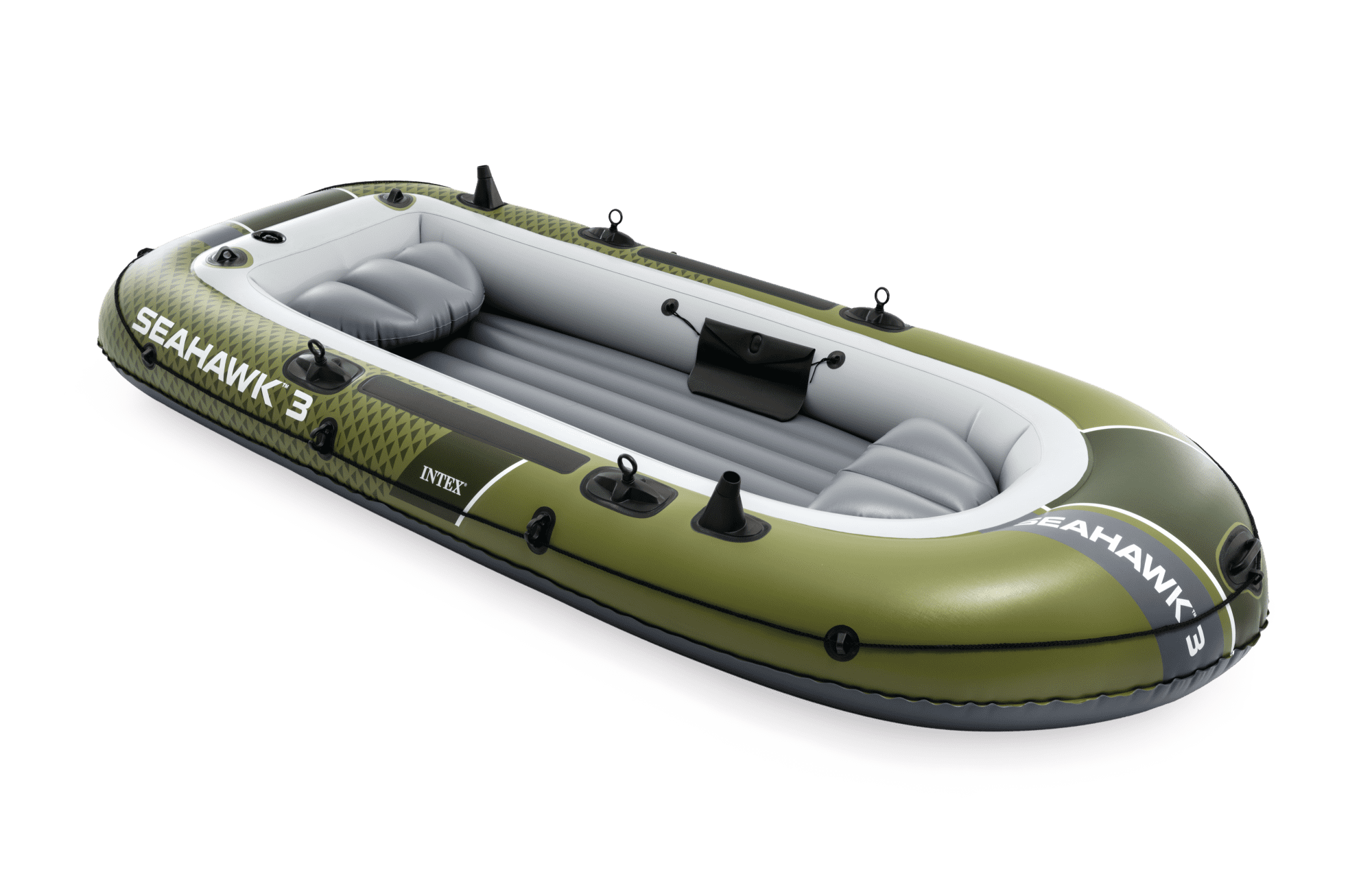 Gumenjak Seahawk™ 3 je prostran i izdržljiv čamac za tri osobe, idealan za ribolov ili opuštajuće veslanje po jezerima, rijekama i moru. Ima tri zračne komore, dva napuhana sjedala i dva držača za štapove za pecanje. Set uključuje aluminijska vesla i pumpu.