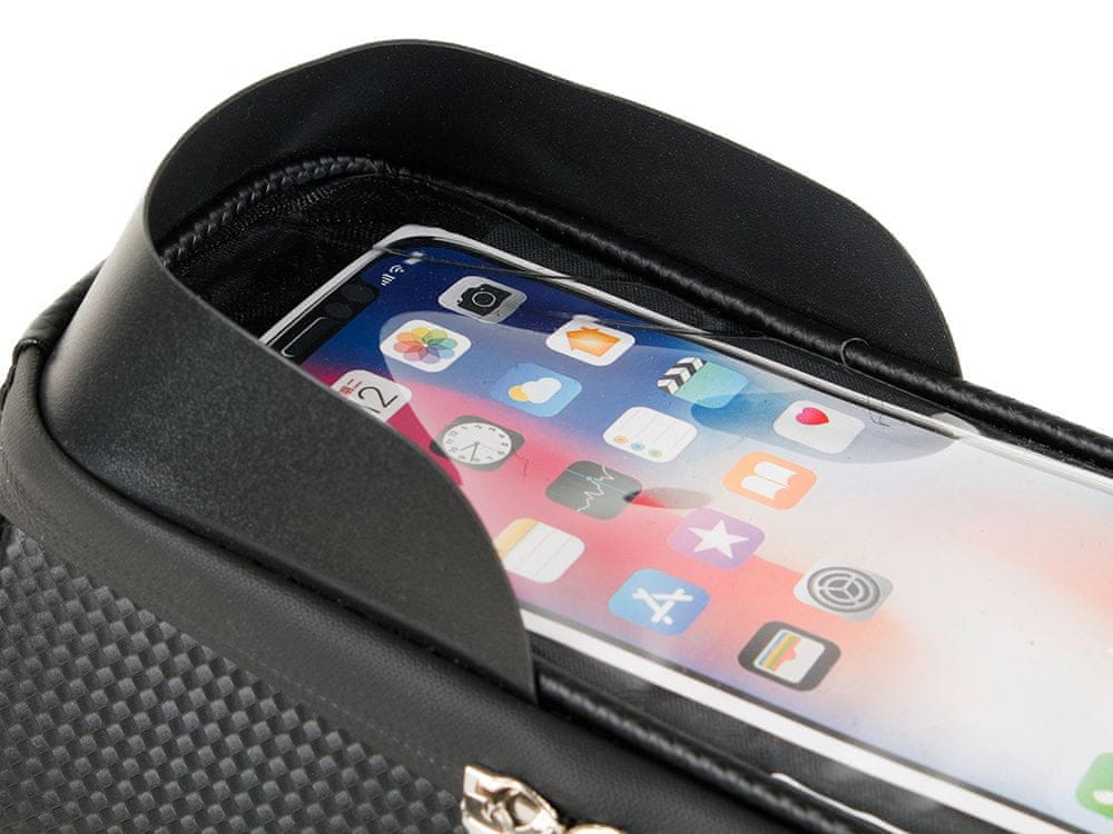 Torba je potpuno očvrsnuta, izrađena od izdržljivog materijala. Praktičan za korištenje, omogućuje korištenje svih funkcija telefona tijekom vožnje biciklom. Pričvršćuje se na okvir bicikla podesivim čičkom. Bit će prikladan za uređaje s dijagonalom od max. 6,8”