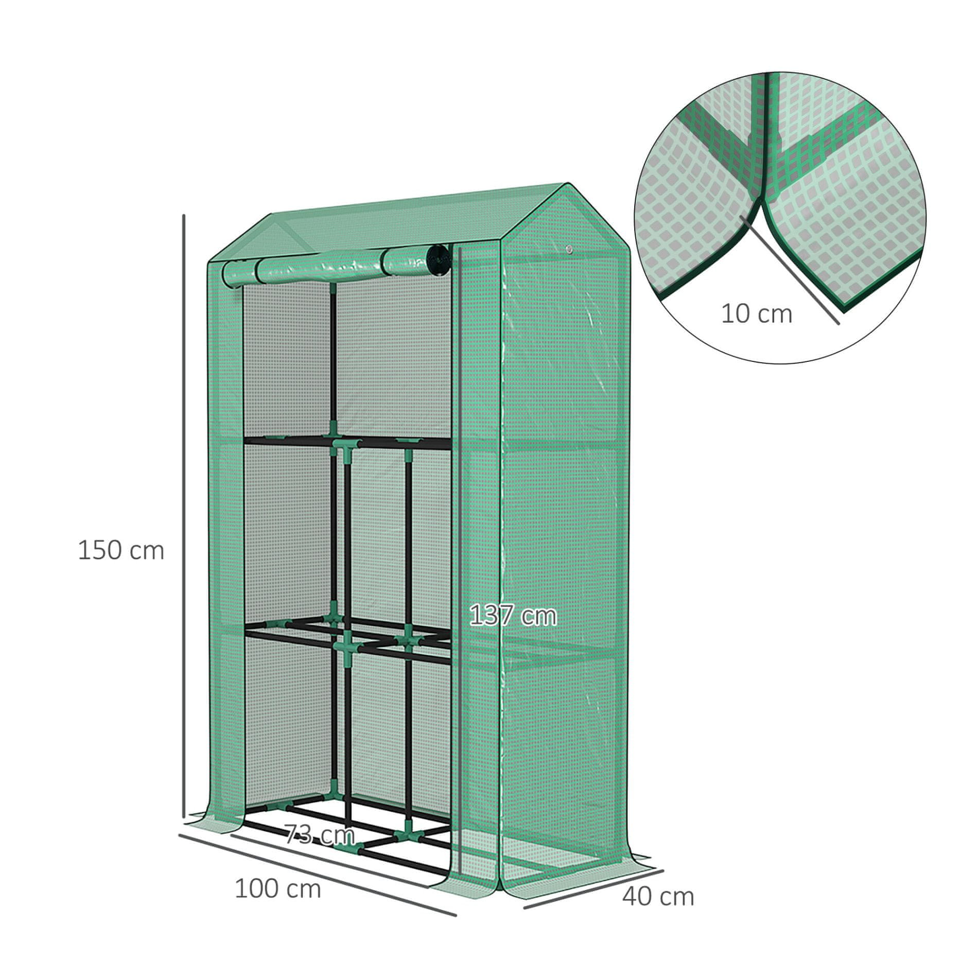 Plastenik je opremljen s tri police, ima vrata na rolanje i laganu konstrukciju, tako da ga možete lako premjestiti prema potrebama.