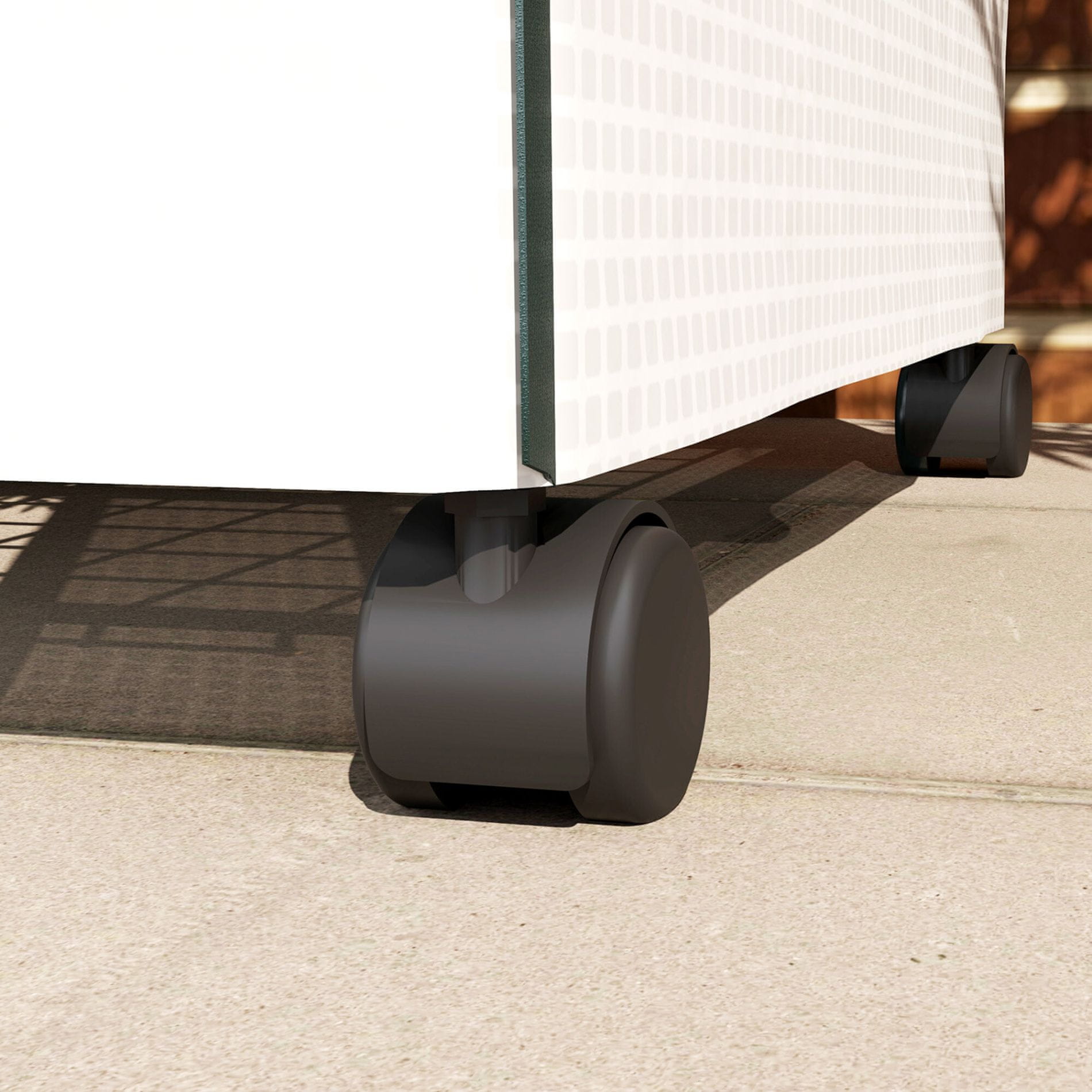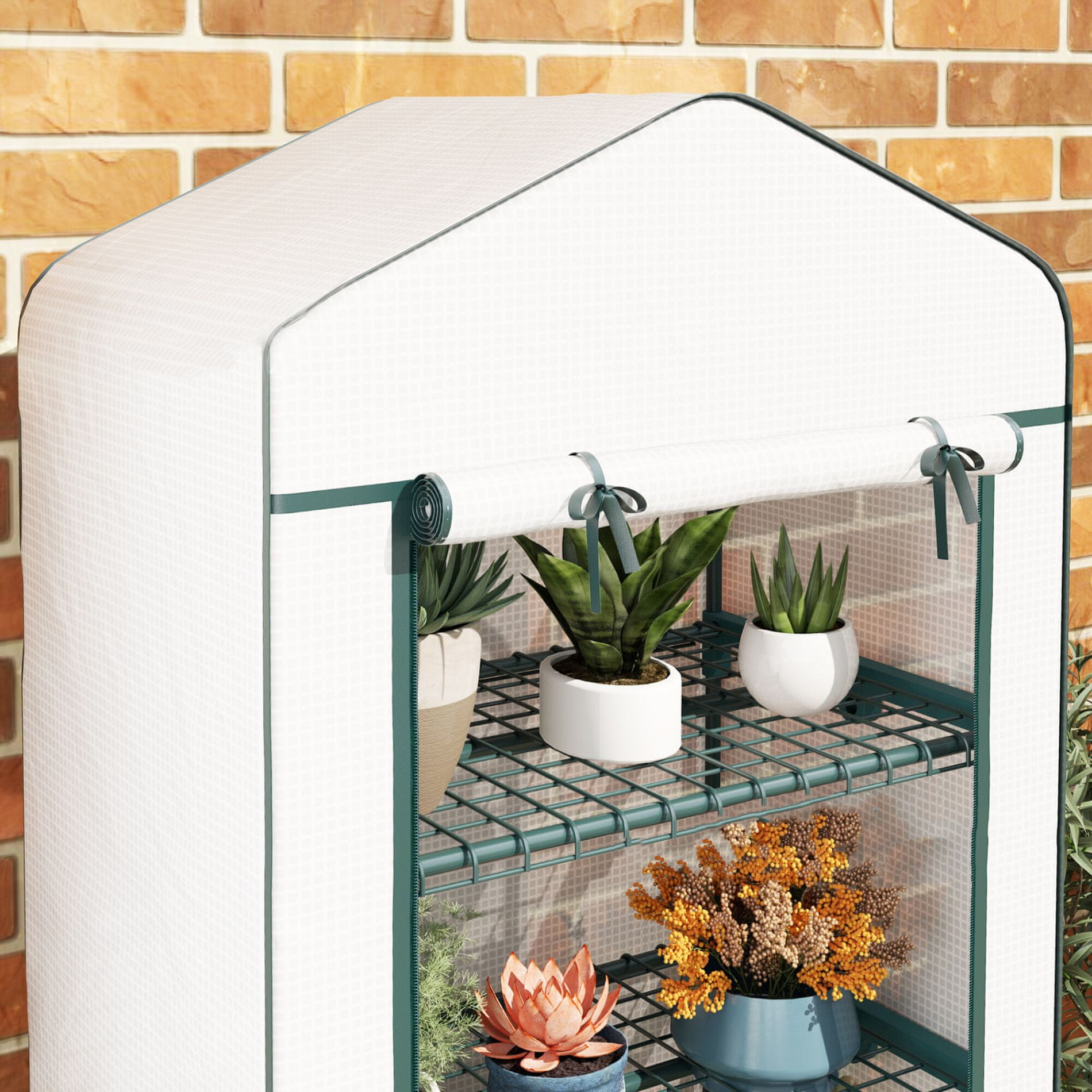 Plastenik je opremljen s četiri police, ima vrata na rolanje i kotačiće, tako da ga možete lako premjestiti prema potrebama.
