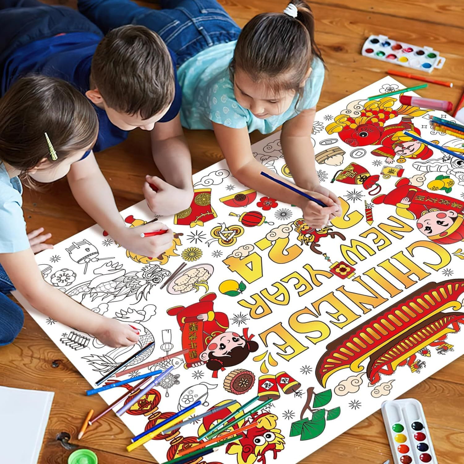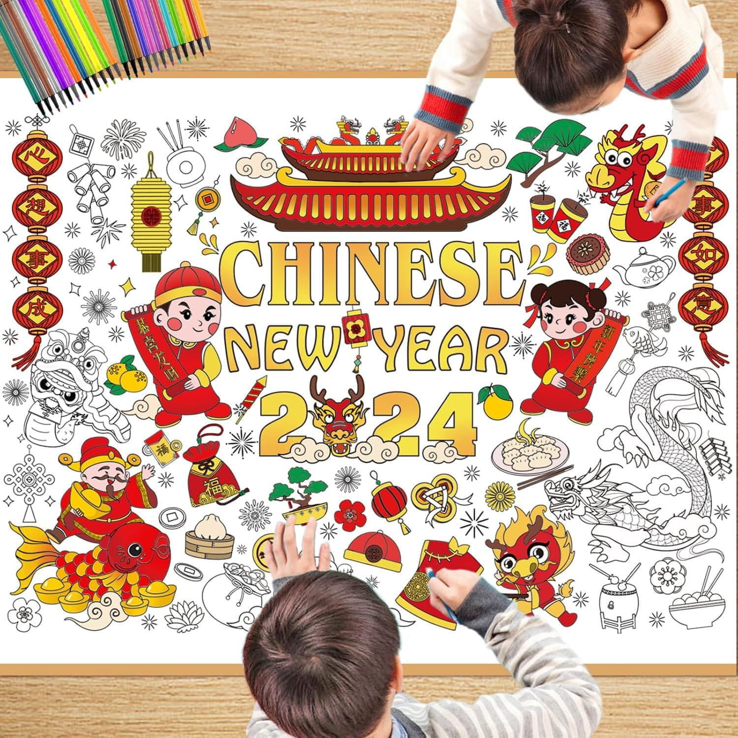 Nikcorp Divovski poster za bojanje s 24 flomastera, edukativna bojanka za djecu, motiv Kineske Nove godine, 118x84,7 cm