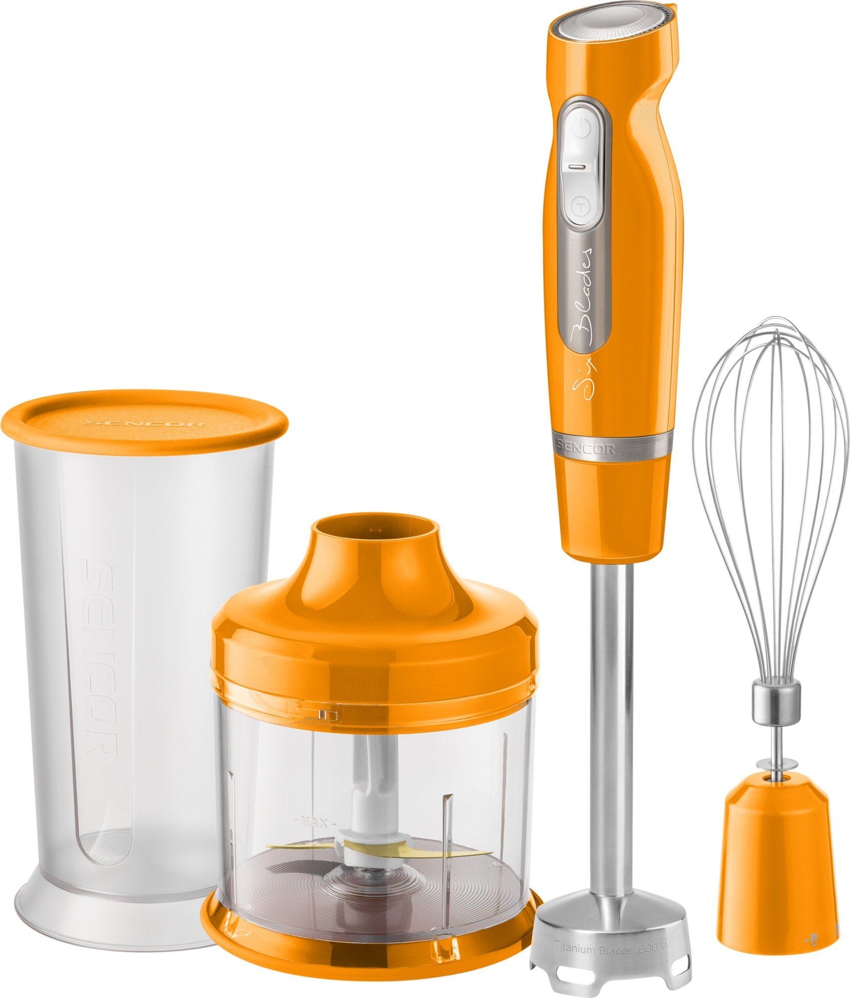 Štapni mikser od 1000 W s tehnologijom Active Speed. SENCOR SHB 4463OR-EUE3 ima 6 oštrica od nehrđajućeg čelika s titanskim premazom i funkcijom ICE Crash. Dodatna oprema uključuje 700-mililitarsku posudu s poklopcem, 500-mililitarsku sjeckalicu i metlicu za miksanje.