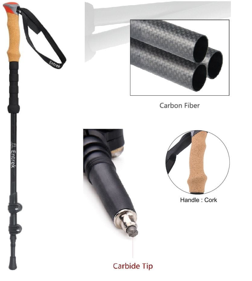 Entrek trodijelni planinarski štapovi za pješačenje s ergonomski oblikovanom ručkom od prirodnog pluta koja omogućuje bolje prianjanje štapova. Podesivi najlonski remeni (S3) za zapešća također pružaju dodatnu sigurnost pri držanju. Donji dio produžene ručke izrađen je od mekane pjene (EVA) koja sprječava klizanje i pruža ugodno držanje sa ili bez rukavica. Šipke su izuzetno lagane zahvaljujući svojoj karbonskoj konstrukciji.