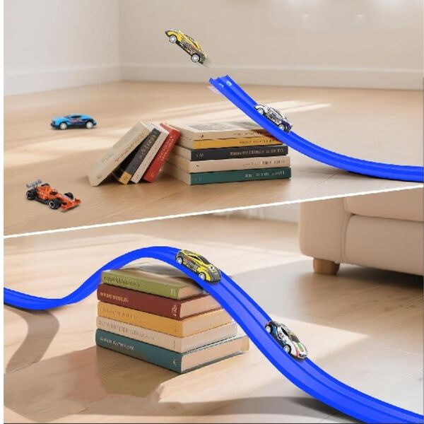 Staza se čvrsto lijepi za većinu glatkih površina pomoću priloženih usisnih čašica, tako da djeca mogu dizajnirati jedinstvene rasporede i petlje. Kada završe, brzo se mota za jednostavno skladištenje i prenosivost.