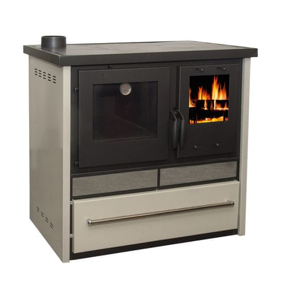 Peć na drva Termo 50 s lijevim izlazom nudi učinkovito grijanje i praktično kuhanje u atraktivnom bež dizajnu.