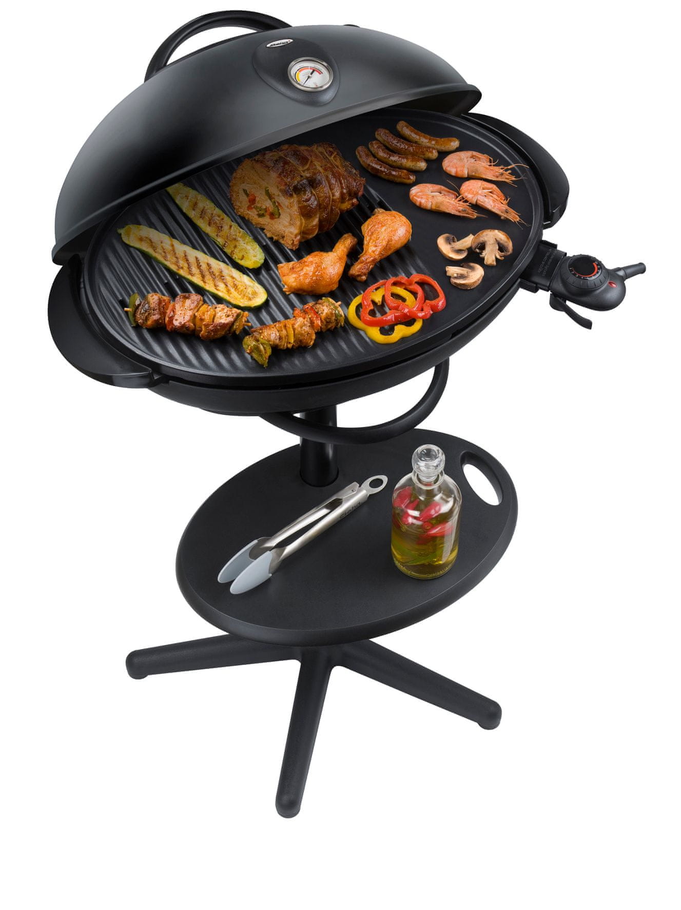 Za balkon i terasu ovaj električni kuglasti roštilj snage 2000W ima ploču promjera 41 cm s keramičkim premazom poklopac s termometrom i stabilno postolje za jednostavno i učinkovito roštiljanje.