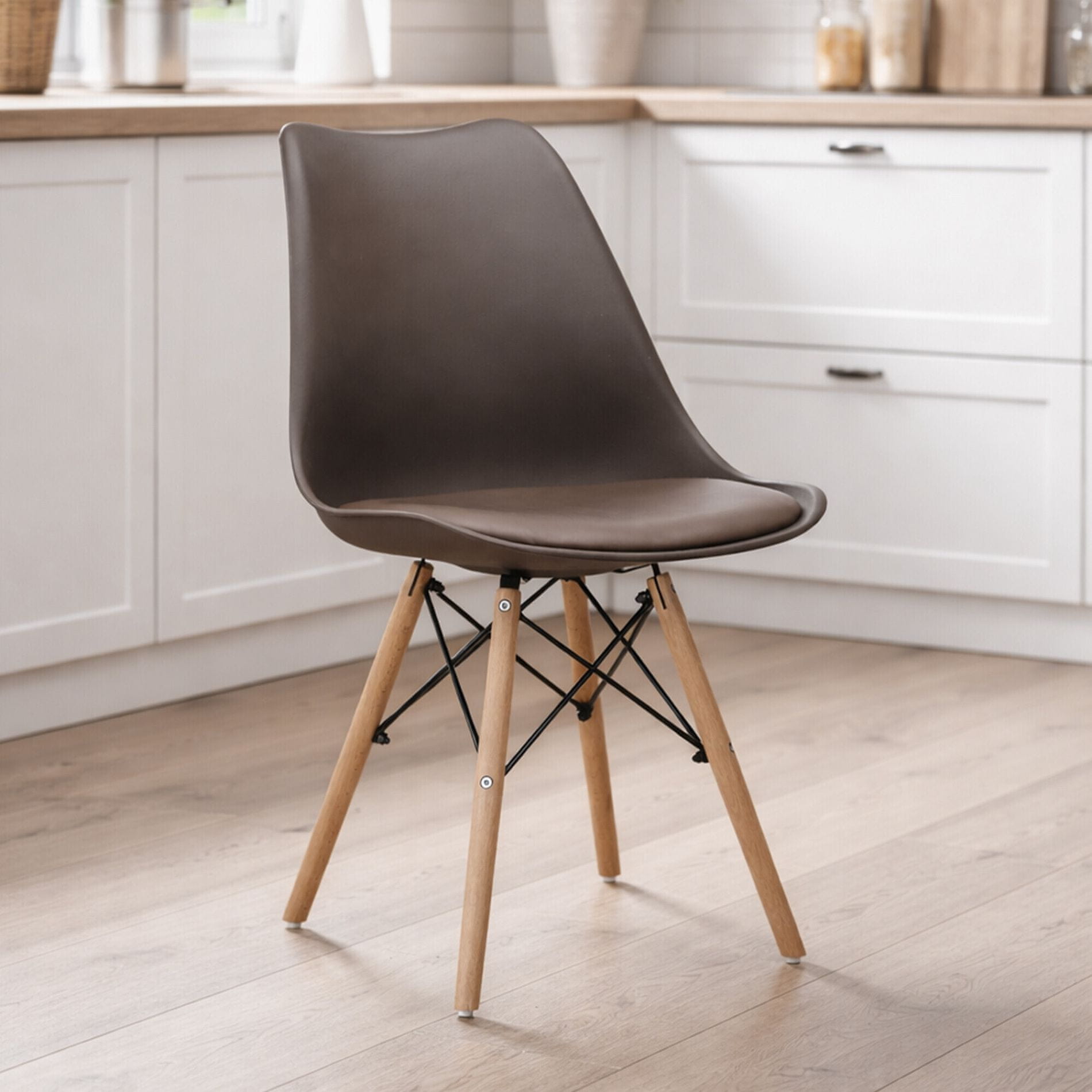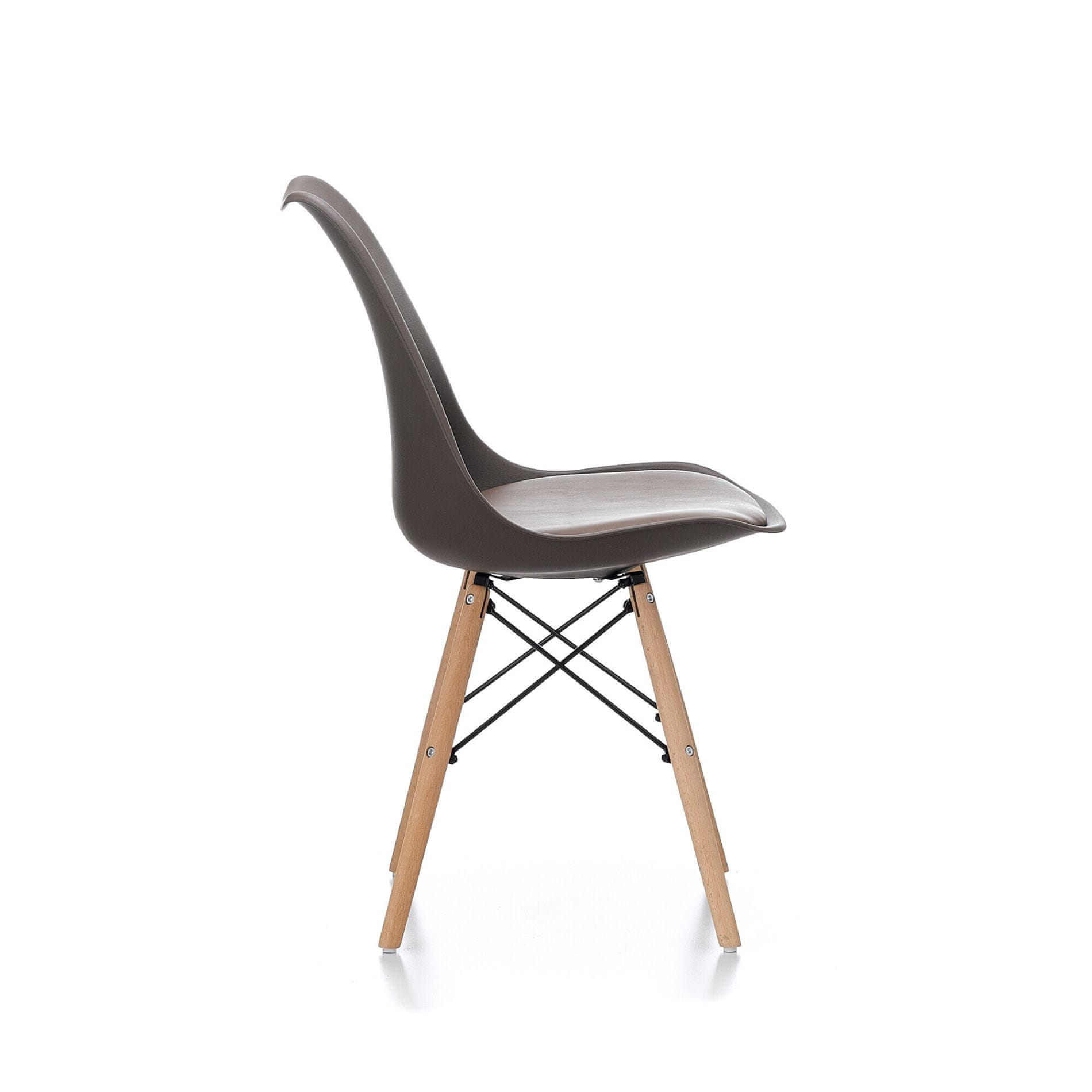Stolica je izrađena od kvalitetnog i izdržljivog polipropilena s jastukom presvučenim umjetnom kožom u kombinaciji s nogama od bukovog drveta.