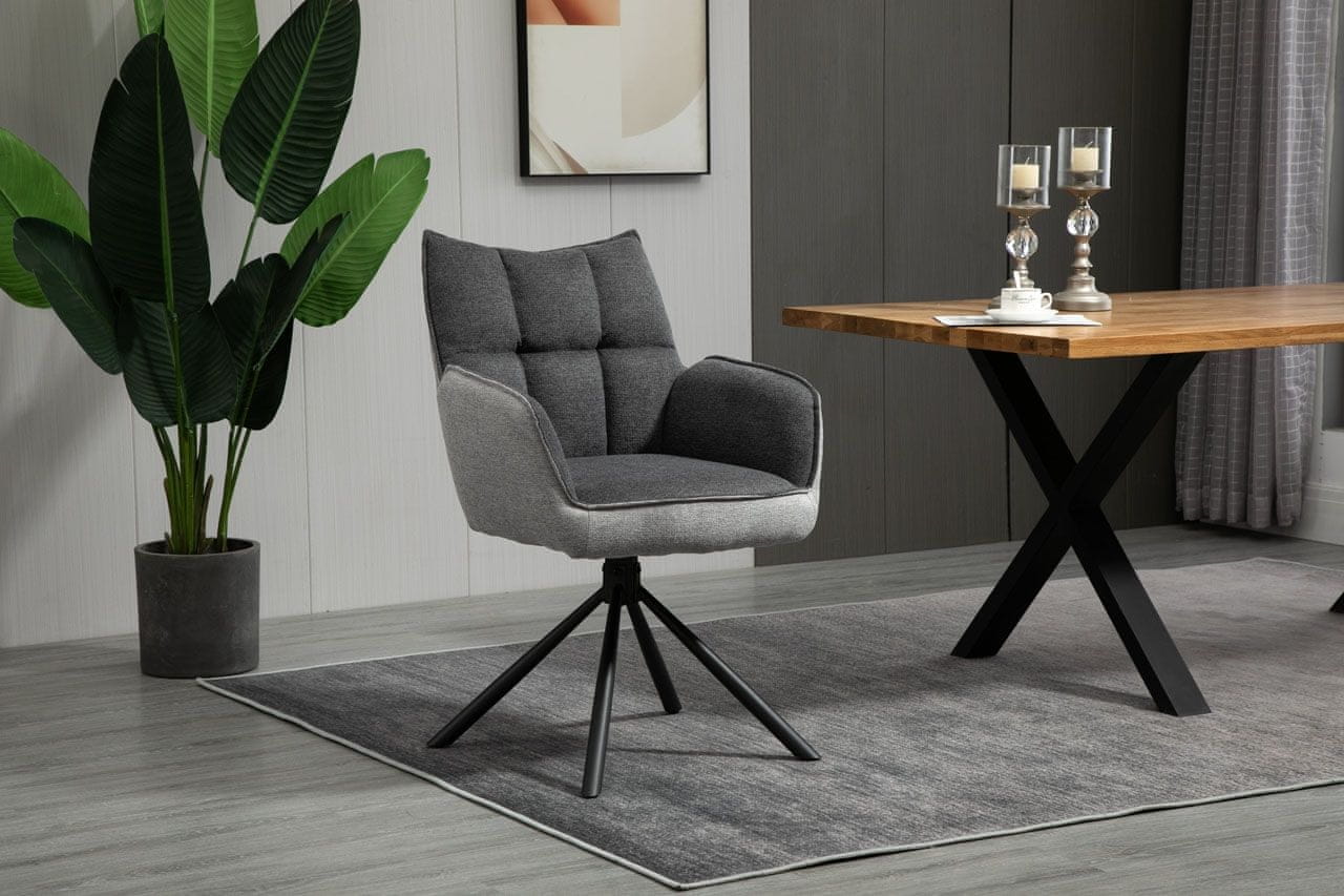 Blagovaonska stolica RINGO 2 unijet će iznimnu udobnost i moderan stil u Vašu blagovaonicu! Ova udobna stolica presvučena je modernom tamno sivom tkaninom i ima kvalitetne džepkaste opruge u sjedalu za maksimalnu udobnost sjedenja. Postolje koje je praškasto lakirano izrađeno je od metala, a stolica se također može rotirati za 180°. Dodatni estetski plus su svijetlosive vanjske strane i ukrasni šavovi kojima je prošivena stražnja strana.