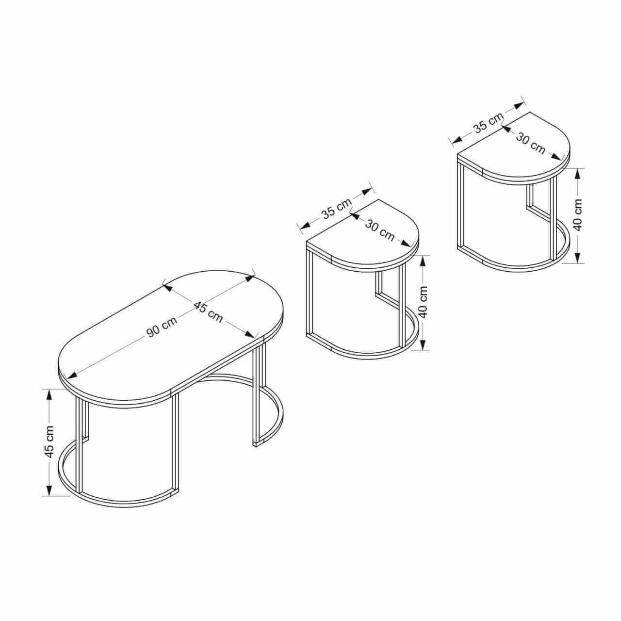 100% čestica obložena melaminom Debljina: 18 mm Metalni okvir Veličina: Širina: 90 cm Visina: 45 cm dubina: 45 cm (1 komad) Veličina: Širina: 35 cm Visina: 40 cm Dubina: 30 cm (2 komada), broj paketa: 1