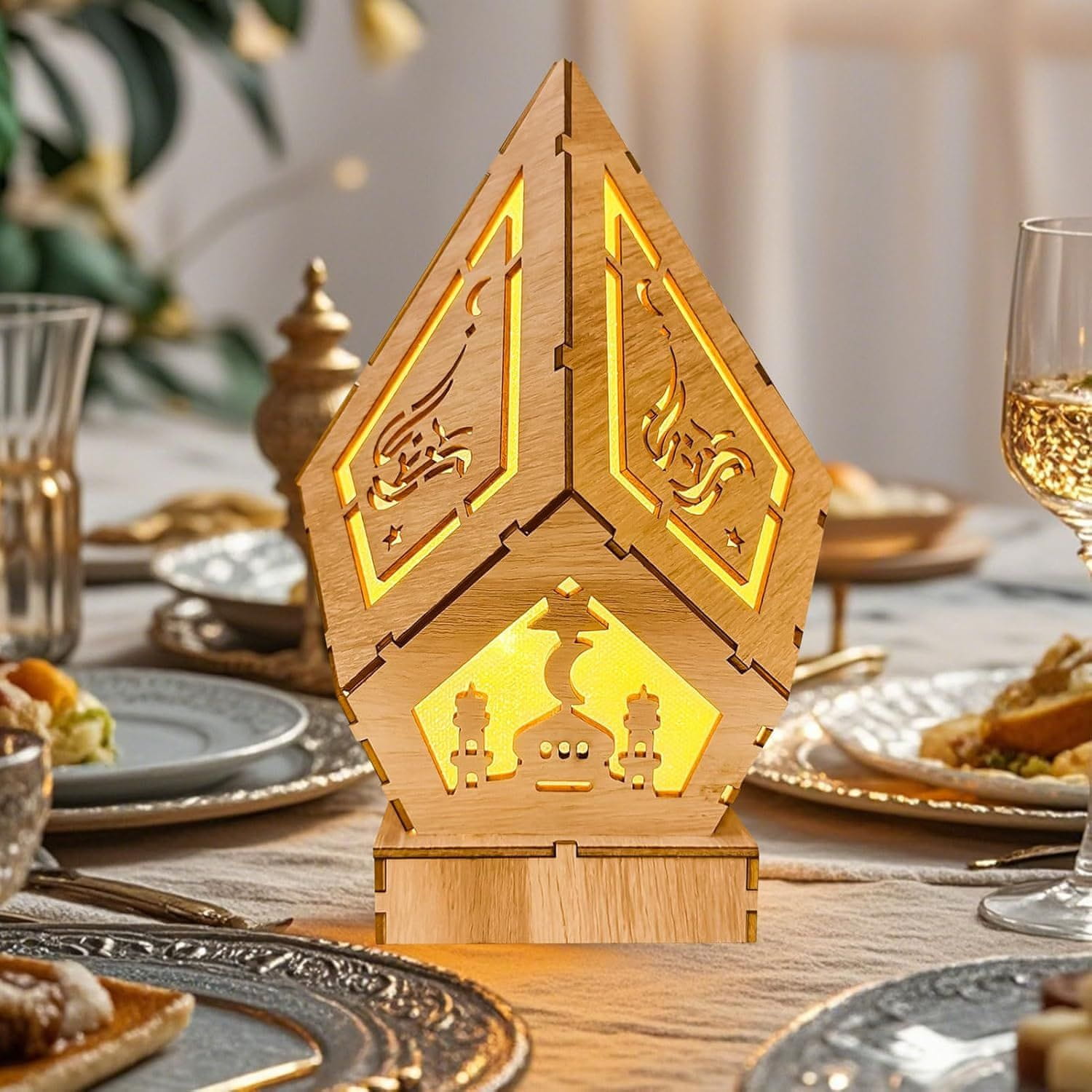 Nikcorp Dekorativna drvena LED svjetiljka za Ramazan i Bajram, islamska dekoracija za dom, stol i terasu, 22 x 14 cm