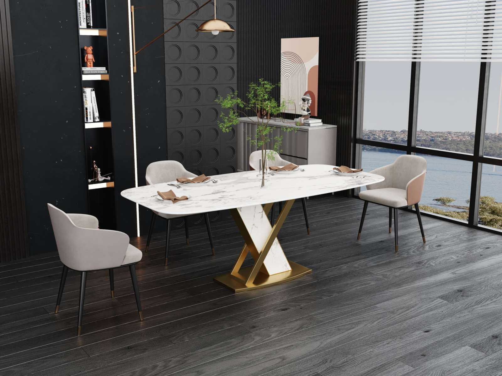 Ovaj moderni blagovaonski stol ima elegantnu bazu u obliku slova X i ploču s izgledom mramora, dodajući dozu elegancije svakom blagovaonskom prostoru. Njegov suvremeni dizajn čini ga savršenim za obiteljske obroke i zabavu gostiju.
