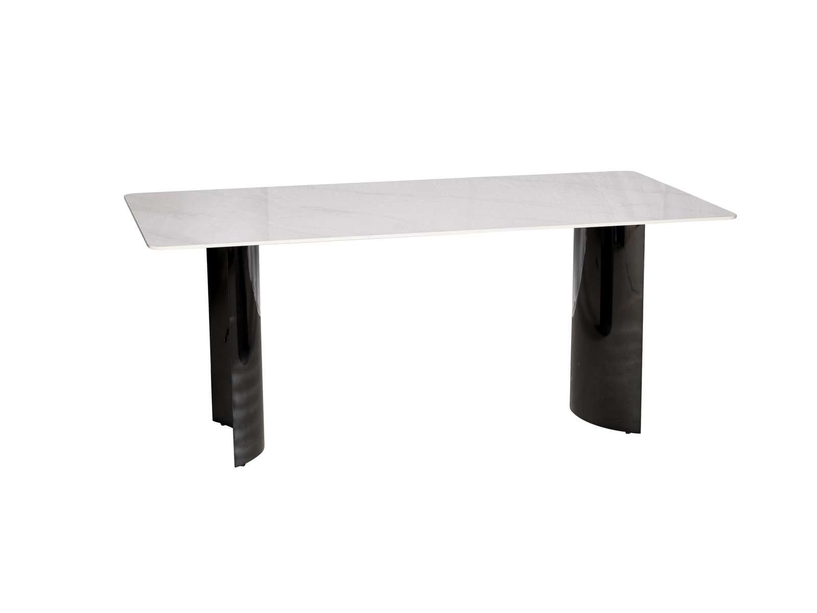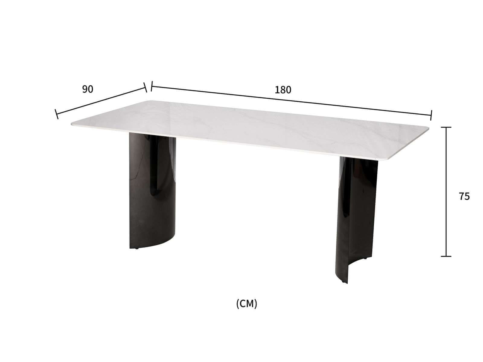 Ovaj minimalistički stol ima moderan dizajn s pravokutnom pločom koja imitira mramor i polukružnim postoljem nogu od nehrđajućeg čelika u grafitnoj boji. Elegantna kombinacija bijele ploče i crnih nogu čini ga prikladnim za suvremene blagovaonice ili uredske prostore. Stol je djelomično sastavljen nudeći stil i praktičnost za svakodnevnu upotrebu.
