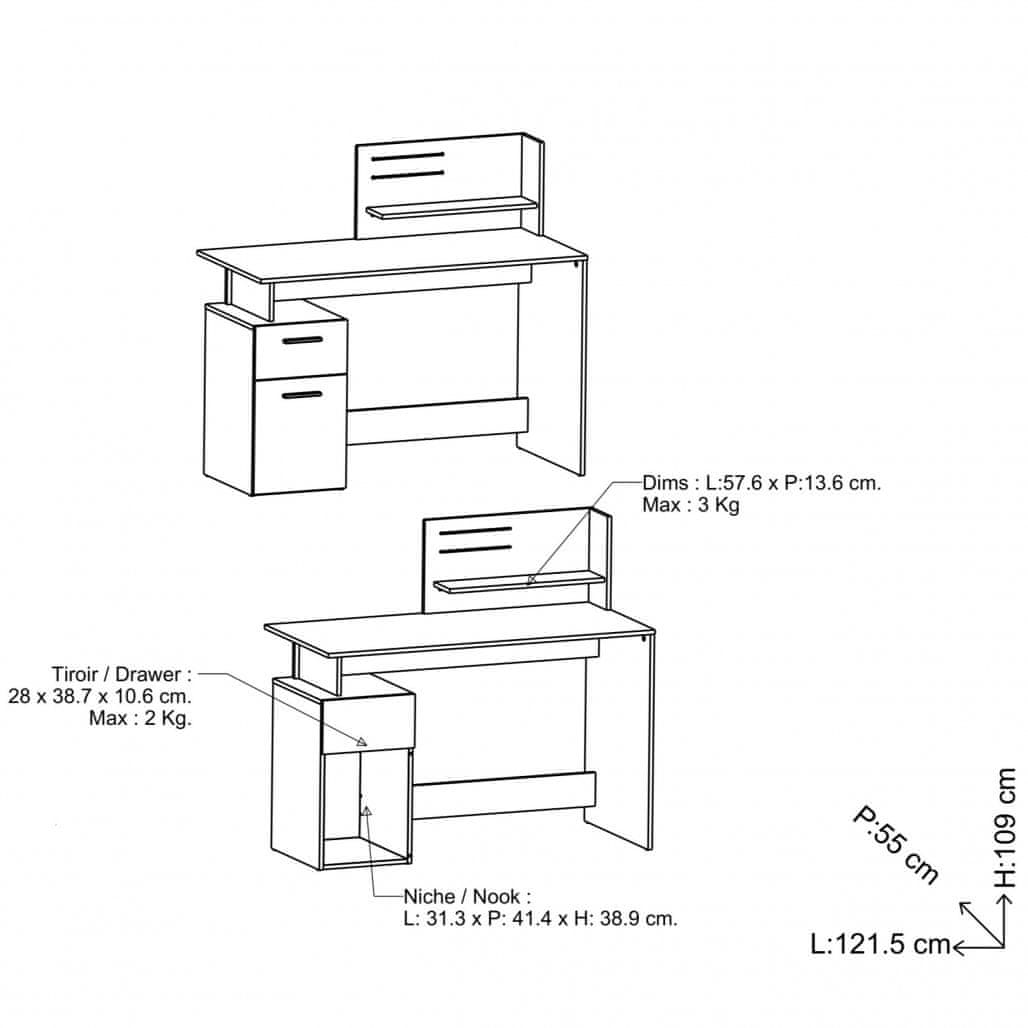 - Radna ploča ima dimenzije 121,5 × 55 cm, ispod nje se s jedne strane nalazi kabinet s jednim vratima dimenzija 31×39×43 cm, jedan ladica dimenzija 28×39×12 cm te iznad ladice još mali otvoreni prostor za odlaganje manjih predmeta