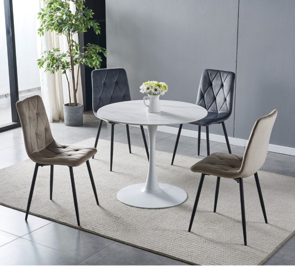 Tražite li manji stol koji će vašem prostoru donijeti čist i moderan izgled? Onda je okrugli stol Interlaken 1 odličan izbor za vas! Prekrasan uzorak bijelog mramora na ploči debljine 1,2 cm savršeno će se uklopiti u svaki prostor. Visoku kvalitetu stola osigurava sinterirani kamen od kojeg je izrađen jer je mnogo čvršći od klasične keramike, a također je vodootporan za razliku od granita i ekološki prihvatljiv.